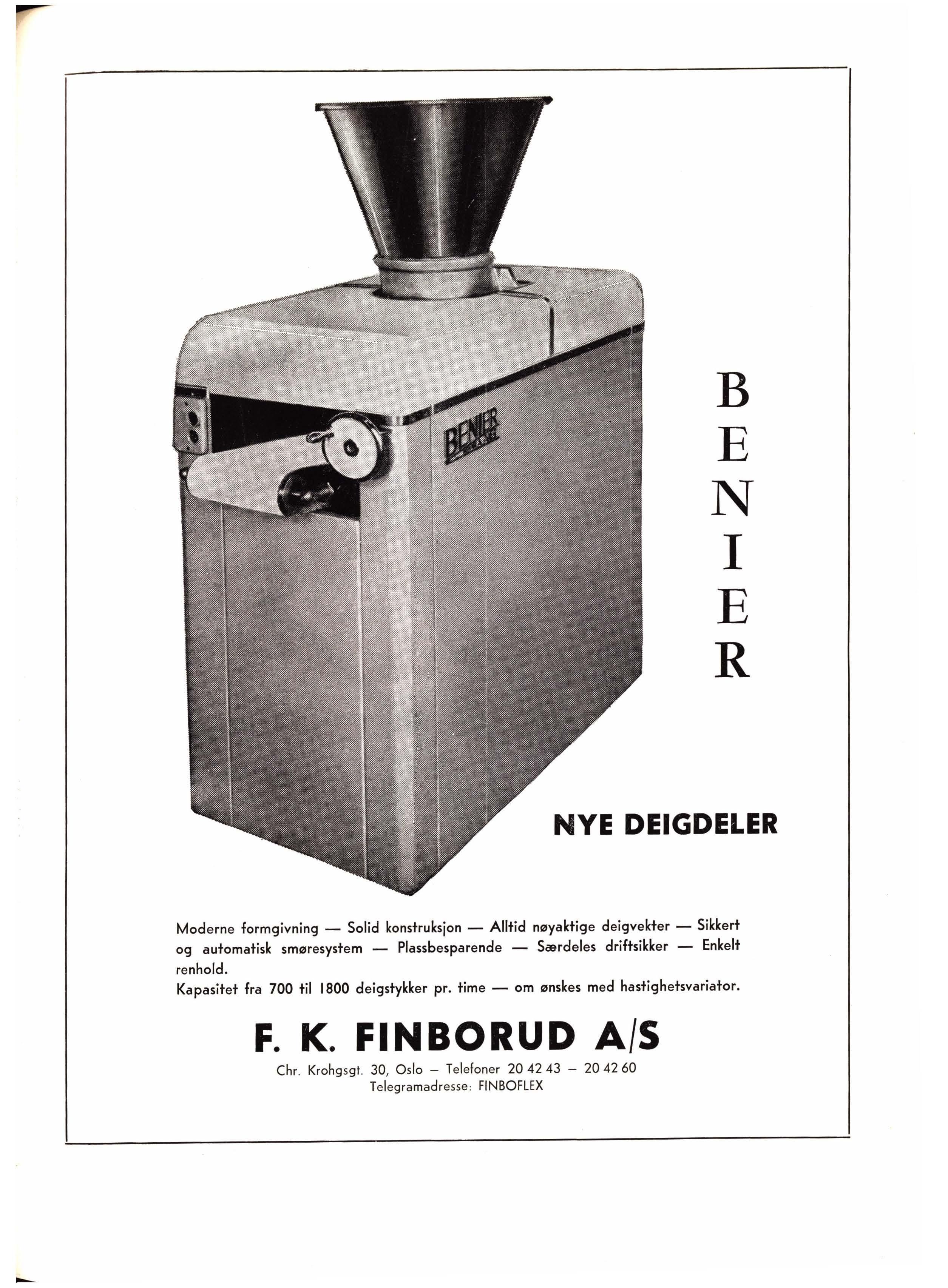 Kontinuerlig deigføring er ikke noe problem lenger Mel, deigvæske med oppløst sukker , salt og gjær , smeltet fett, pumpes frem via målepumper og innføres i elt eren , hvorfra deigen kommer ut i en jevn strøm og går videre via hvilebånd til dele- og formemas kiner , som i dette tilfelle også omfatter en langruller tilpasset de avlange boller som skal lages. Det opplyses at melsiloene, som t ilsammen rommer 30 tonn mel, holder til tre dagers forbruk. Etter langrulling føres deigemnene videre til automatisk , vandrende raskebane hvor de får en 40 minutters rask Herfra går de på 2,5 meter brede bånd til en 18 meter lang ovn i to etasjer med 240-250 graders temperatur Her bakes samtidig 5000 kavringbol-