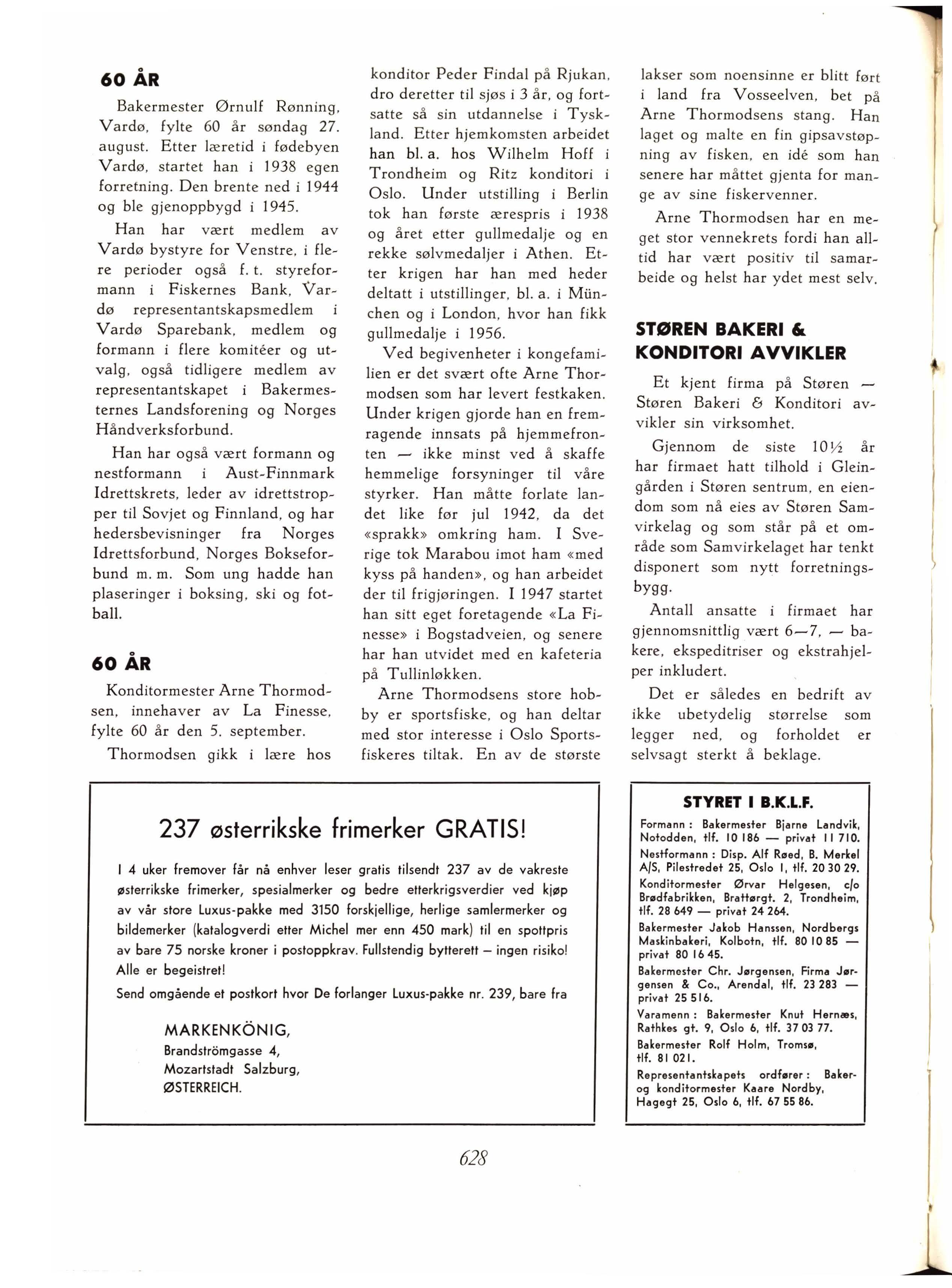 Bakermester Ørnulf Rønning, Vardø , fylte 60 år søndag 27 august. Etter læ retid i fødebyen Vardø , startet han i 1938 egen forretning . Den brente ned i 1944 og ble gjenoppbygd i 1945 . Han har vært medlem av Vardø bystyre for Venstre , i flere perioder også f. t. styreformann i Fiskernes Bank , Vardø representantskapsmedlem Vard ø Sparebank , medlem og formann i flere komiteer og utvalg , også tidligere medlem av representantskapet i Bakermesternes Landsforening og Norges H ån dverksforbund