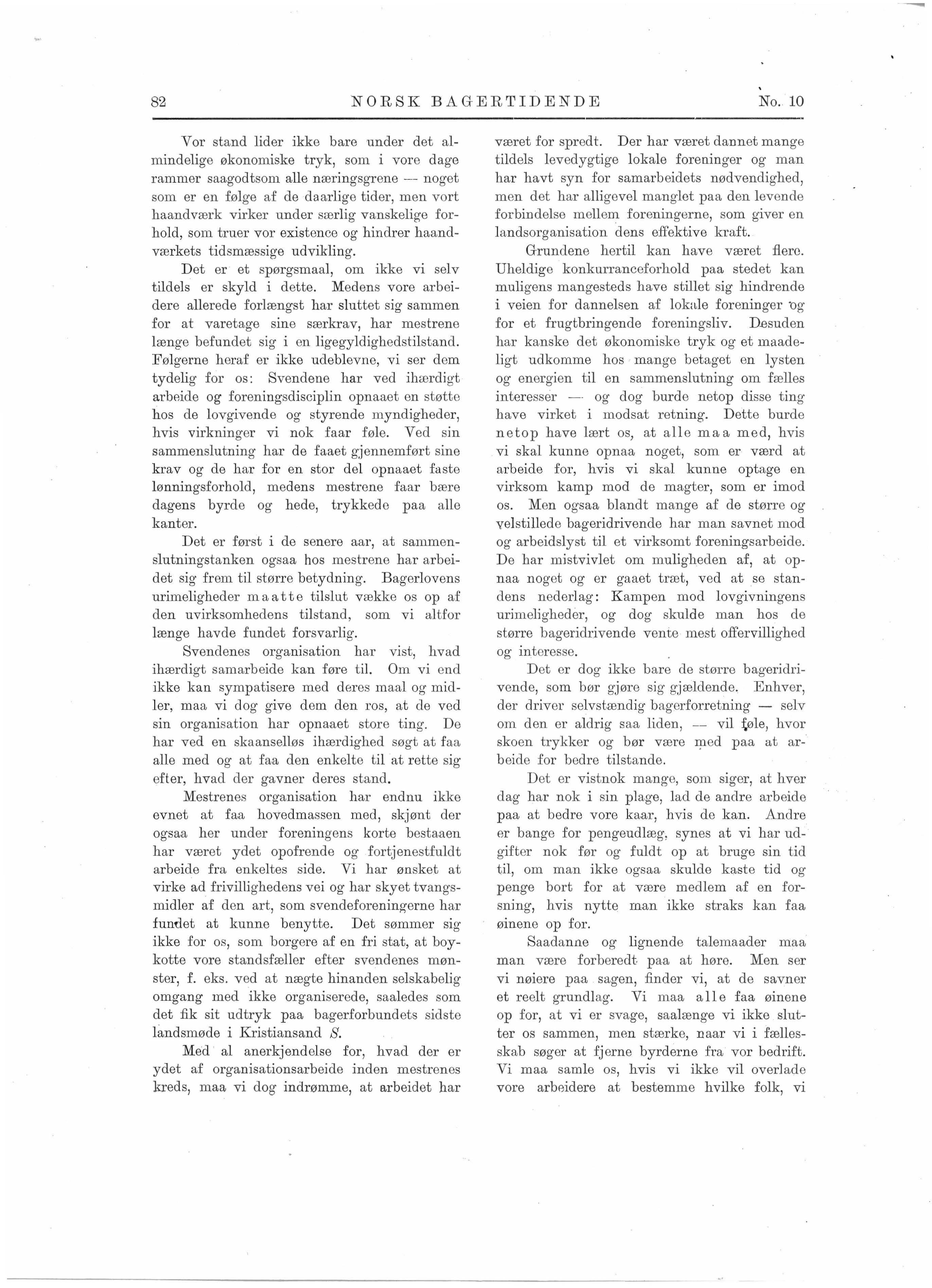 været for spredt Der har været dannet mange tildels lev edygtige lokale foreninger og man har havt syn for samarbeidets nødvendighed, men d et har alligevel man glet paa den lev ende forbindelse mellem foreningerne, som giver en landsorganisation dens effektive kraft. Grundene hertil kan have været flere. Uheldige konkurranceforhold paa stedet kan muligens mangesteds have stillet sig hindrende i veien for dannelsen af lokale foreninger ·og for et frugtbringende foreningsliv. D.esud en har kanske det økonomiske tryk og et maadeligt udkomme hos mange betaget en lysten og energien til en sammenslutning om fælles intere sser -· og dog burde netop disse ting have virket i modsat retning. Dette burde netop have l ært os, at alle ma a med, hvi s vi skal kunne opnaa noget, som er værd at arbeide for, hvis vi skal kunne optage en virksom kamp mod de magter, som er imod os. Men ogsaa blandt mange af de størr e og velstillede bageridrivende har man savnet mod og arbeidslyst til et virksomt foreningsarbeid e De bar mistvivlet om muligheden af, at opnaa noget og er gaaet træt, ved at se standens nederlag: Kampen mod lovgivningens urimeligheder, og dog skulde man hos de større bageridrivende vente mest offervillighed og int er esse