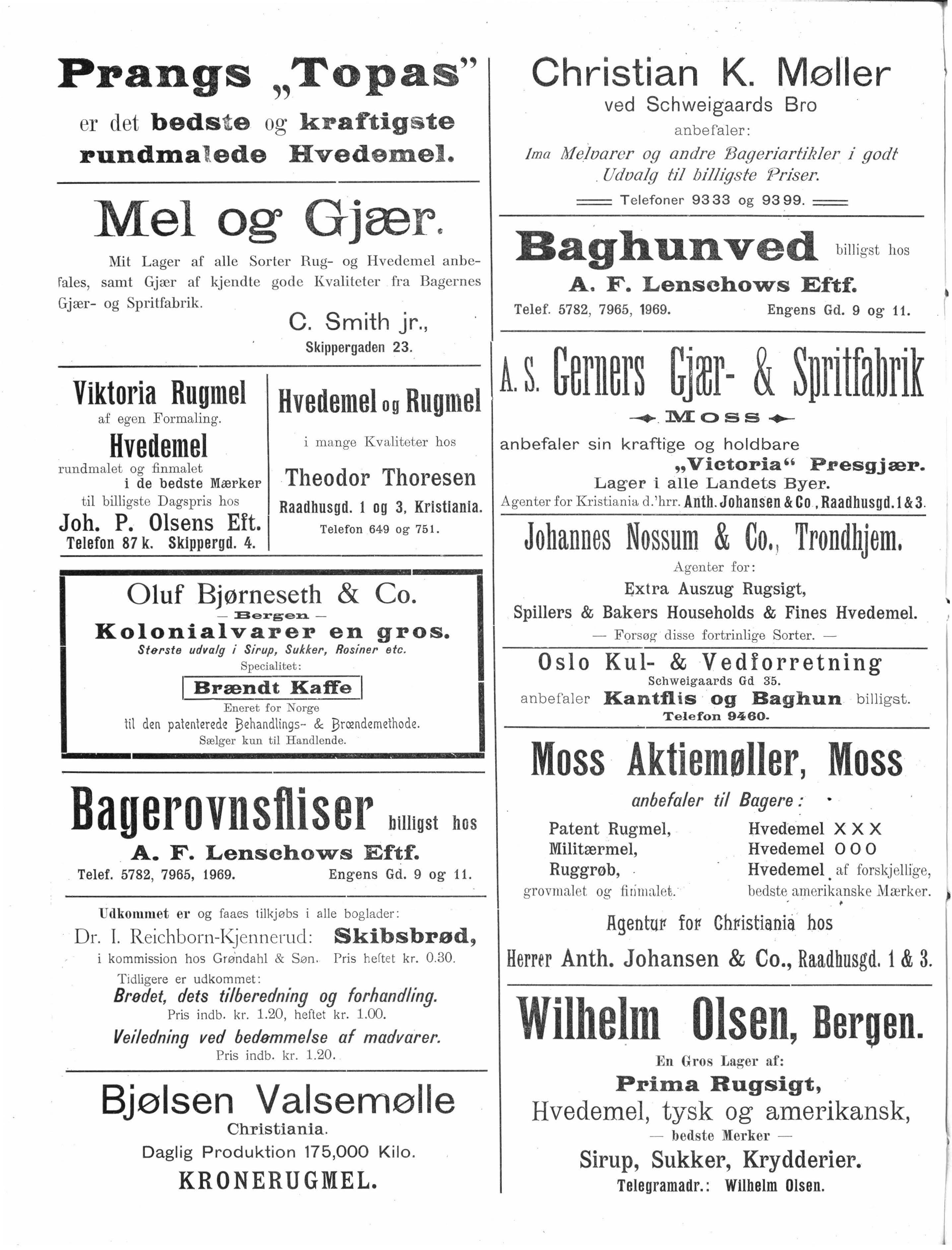 er a n er k j en dt som det _ beds t e i Han de l og anbefale s d e Herrer Bageri driv en de Telegr ama dr .: B agerfo rretn in g. Tele fo n 1490.