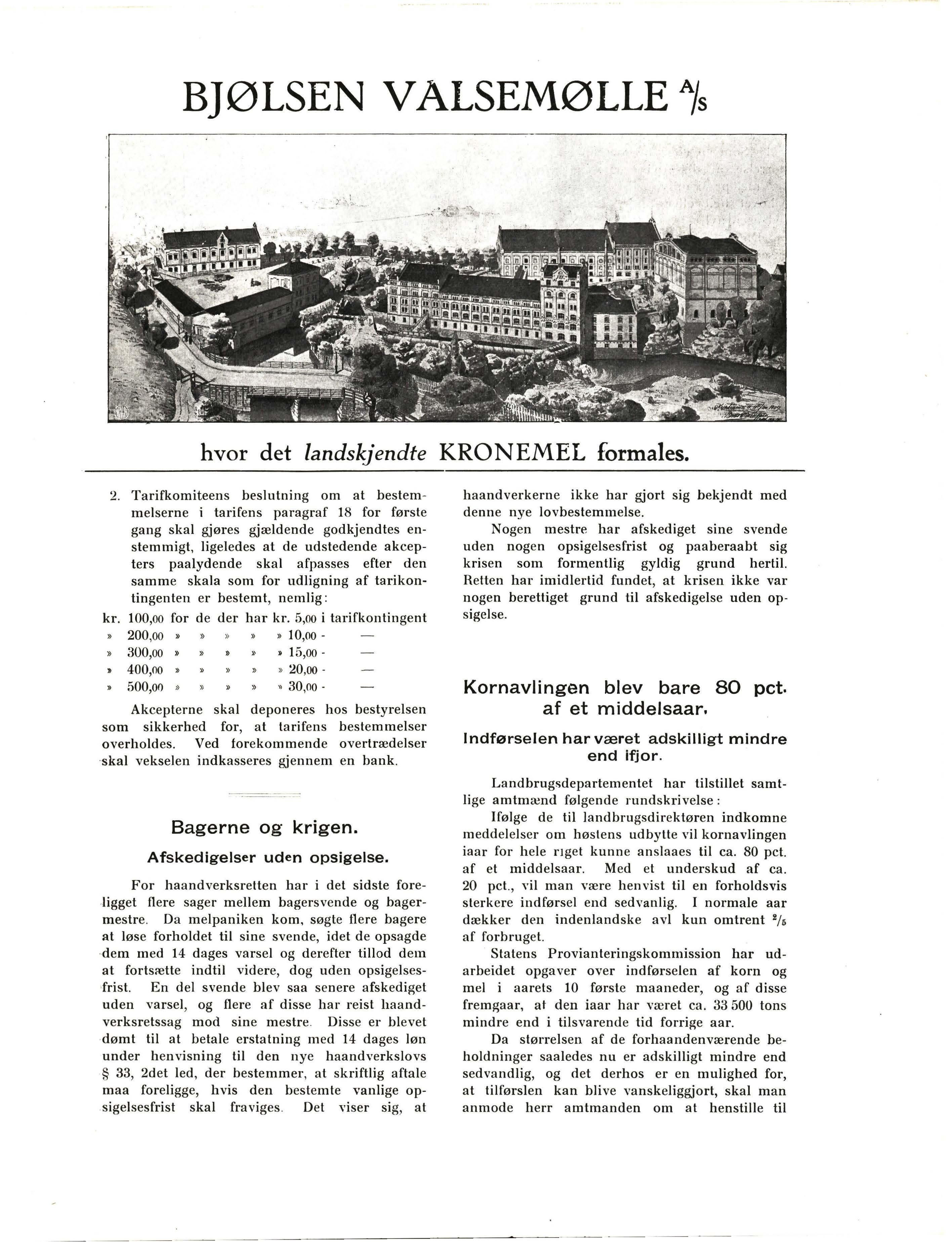 Som del vil erindres, bestemte provianteringskommissionen i begyndelsen af krisen, at prisen paa det gjængse husholdningsbrød skulde være 32 øre pr. kilo, og da stod rugmelsækken i kr 23,oo. Alle var da enige om, at denne pris var snau nok, men nu da den laveste pris efter ny forsyning har været kr. 29,oo - ja der er endog betalt op til kr. 33,oo - maa den mest elemen tære regnemester maatte kunne indse, at det er det rene tul, naar det kan paastaaes, at man kan klare sig med en pris af 35 øre pr. kilo, og om saa virkelig er tilfældet, saa var jo provianteringskommissionens ansættelse langt over det, som kan karakteriseres som en rimelig fortjeneste.