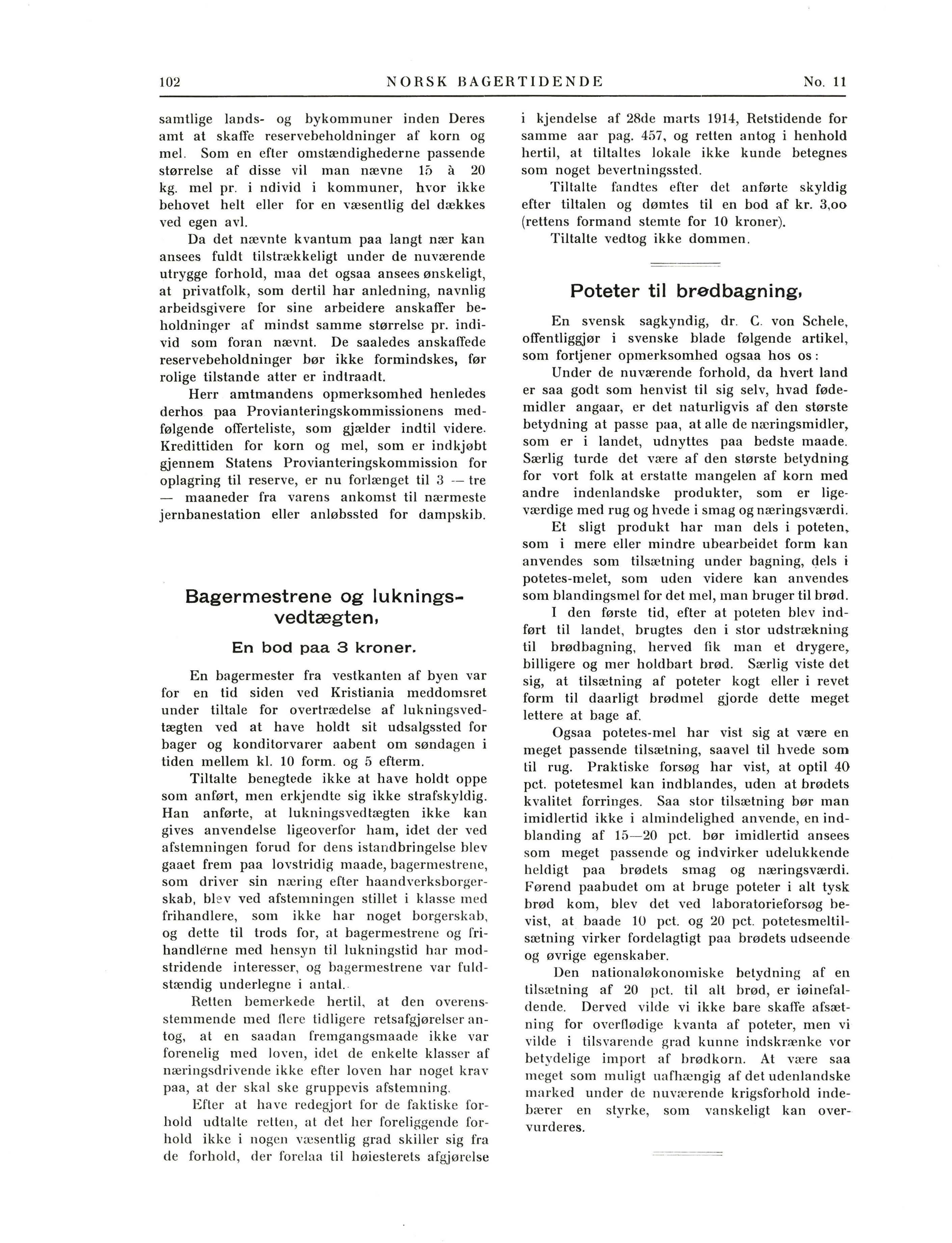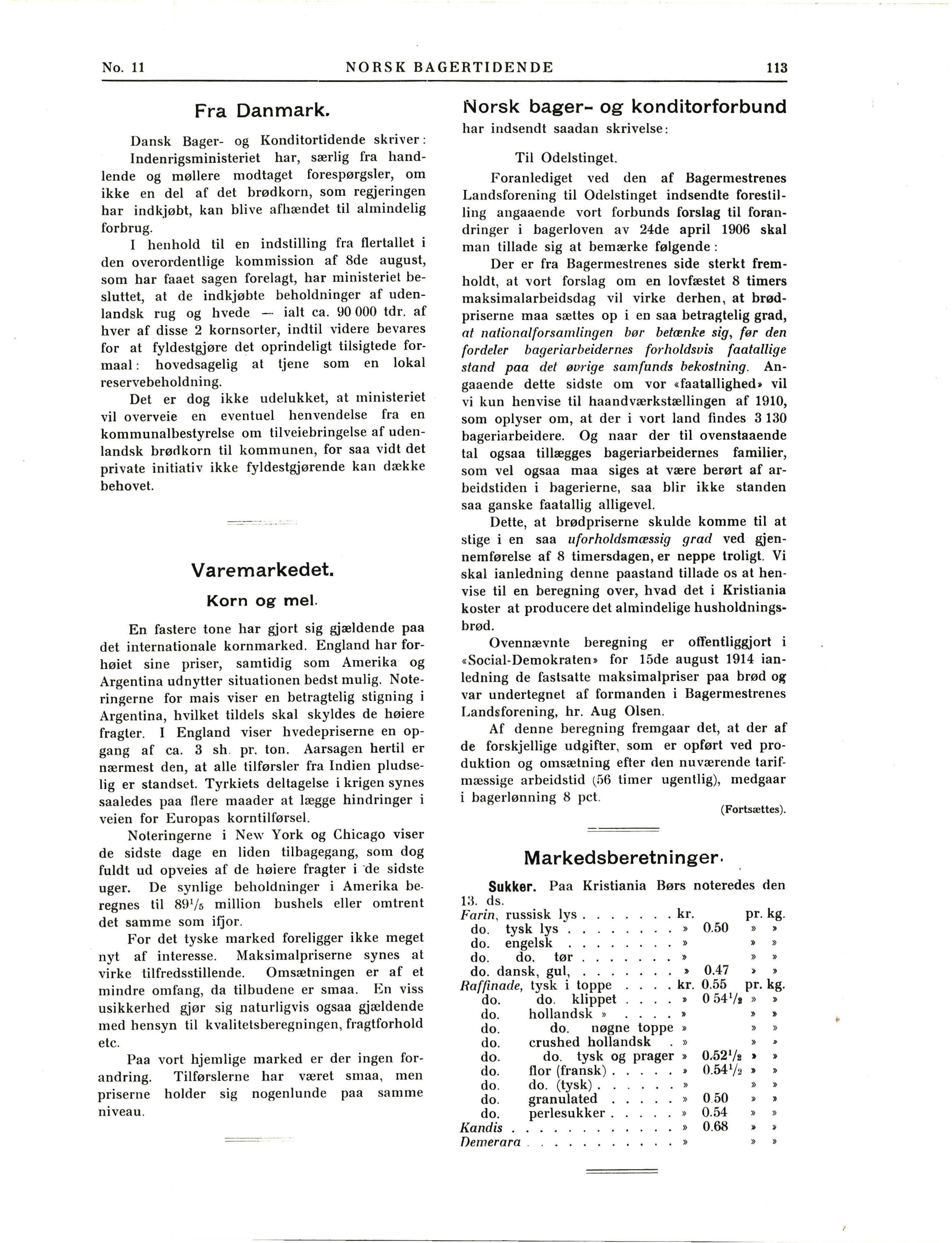 Indhold: Vore mænd. 0. Scharff. - Det ubrugbare mel fra Skiens aktiemø lle. - Brødpriserne. - De bageridrivende i Kristiania. - Bagerne og krigen.Kornavlingen blev bare 80 pct af et middelsaar. - Bagermestrene og lukningsv edtæg t en. - Poteter til brødbagning. - Fra Danmark. - Varemarkedet. - Norsk bager- og konditorforbund. - Markedsberetninger.
