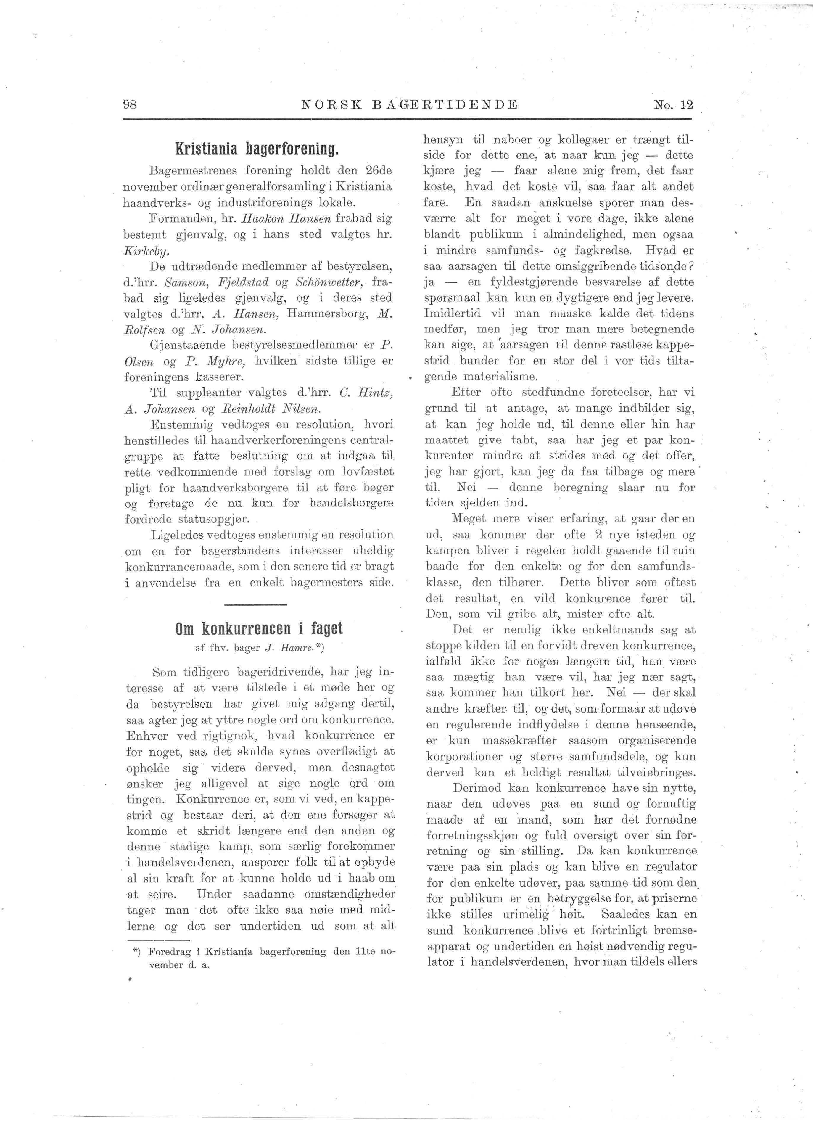 Som tidligere bageridrivende, har jeg mteresse af at være tilstede i et møde her og da bestyrelsen har givet mig adgang dertil, saa agter jeg at yttre nogle ord om konkurrence. Enhver ved rigtignok, hvad konkurrence er for noget, saa det skulde synes overfl.ødigt at opholde sig videre derved, men desuagtet ønsker jeg alligevel at sige nogle ord om tingen Konkurrence er, som vi ved, en kappestrid og bestaar deri, at den ene forsøger at komme et skridt ]ængere end den anden og denne · stadige kamp, som særlig forekommer i handel sver denen, ansporer fo lk til a t opbyde al sin kraft for at kunne holde ud i haab om at seire. Under saadanne omstændigheder· tage r man det ofte ikke saa nøie me d midlerne og det ser underti den ud som _ at a lt