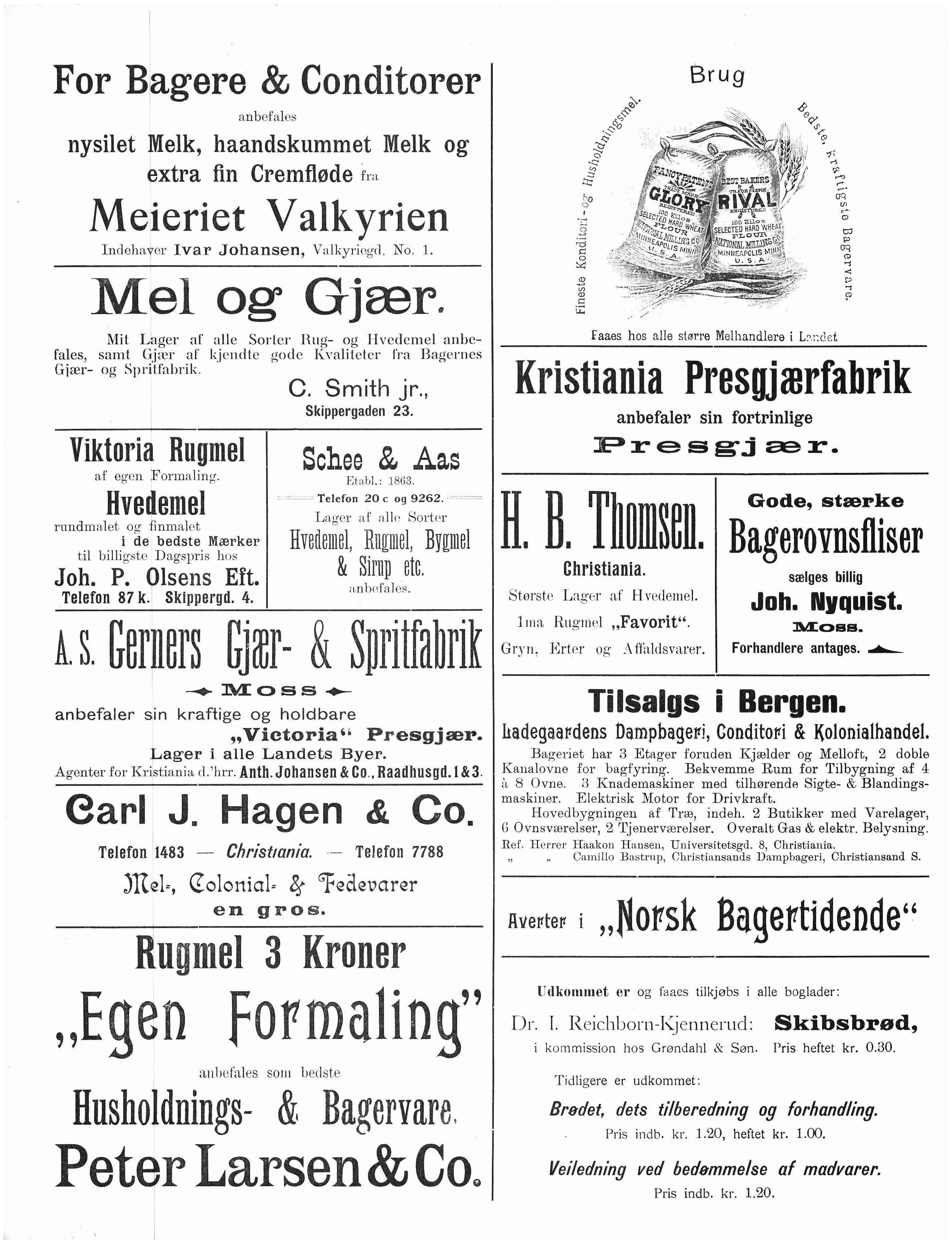 Særegne Ovne med kontinuerlig Drift for KnækkebPød. Deigvalse. - Udstikningsmaskiner. - Nudel- og Maccaronipresser. - Sigtemaskiner. - Deigdelingsmaskiner. - Tablettepresser for Conserving , Chocolade- & Cacaofabriker. - Bagertrauge. - Transportable Tobbe- & Brødstandere og all e ø vrige Bageriredskaber. - Talrige Referencer i Norge staar efter Ønske til Tjeneste. S. & Jul Sørensens bogtrykkeri, Kristiani a