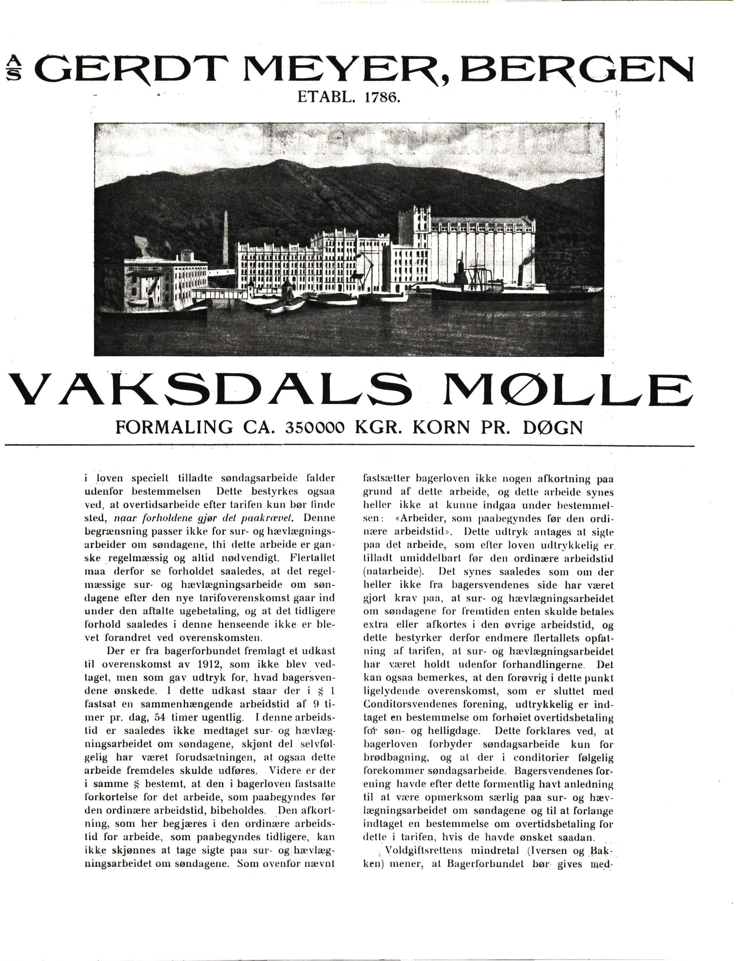 Der er fra bagerforbundet fremlagt et udkasl til overenskomst av 1912, som ikke blev vedlaget, men som gav udtryk for, hvad bagersvendene ønskede I dette udkast staar der i s l faslsat en sammenhængende arbeidstid af 9 limer pr . dag, 54 limer ugentlig . I denne arbeidstid er saaledes ikke medtaget sur- og hævl ægningsarbeidet om søndagene, skjønt del selvfølgelig har været foruds æ tningen, at ogsaa dett e arbeide fremdeles skulde udføres . Videre er der i samme bestemt, at den i bagerloven fastsatt e forkortelse for det arbeide, som paabegyndes f'ør den ordinære arbeidstid, bibeholdes. Den afkorlning , som her begjæres i den ordinære arbeidstid for arbeide, som paabegyndes tidligere, kan ikk e skjønnes al tage sigte paa sur- og : hævlægningsarbeidet om søndagene. Som ovenfor nævnl