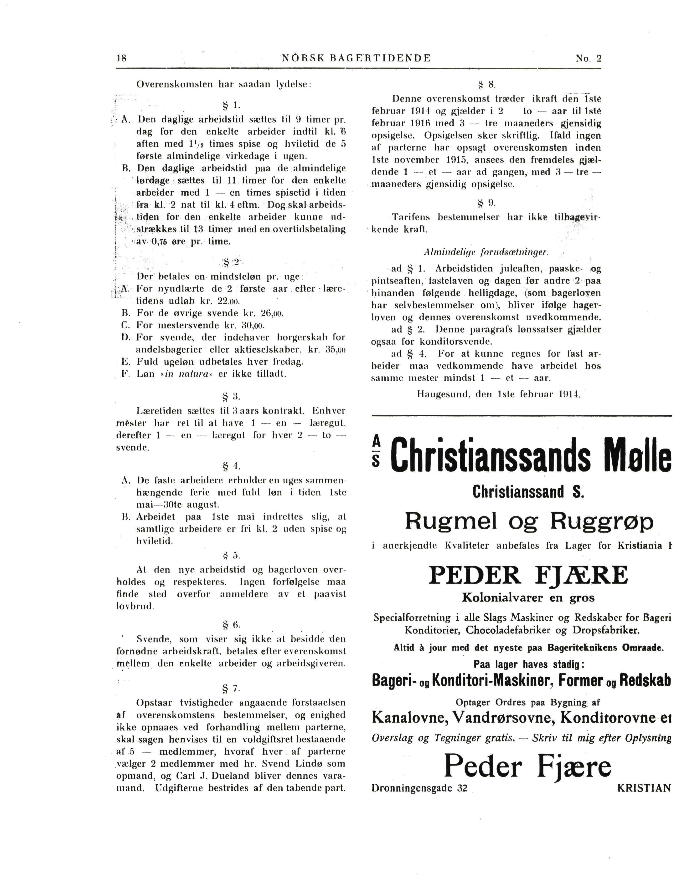 Oenne overenskomst lræffer ikraft den - fste februar 1914 og gjælder i 2 lo - aar til lste februar Hllfi med 3 - tre maaneders gjensidig opsigelse. Opsigelsen sker skriftlig. lfald ingen af parlerne har opsagl overenskomsten inden lste november 1915, ansees den fremdeles gjælrlende 1 el - aar ad gangen, med 3 - tremaancders gjensidig opsigelsc.