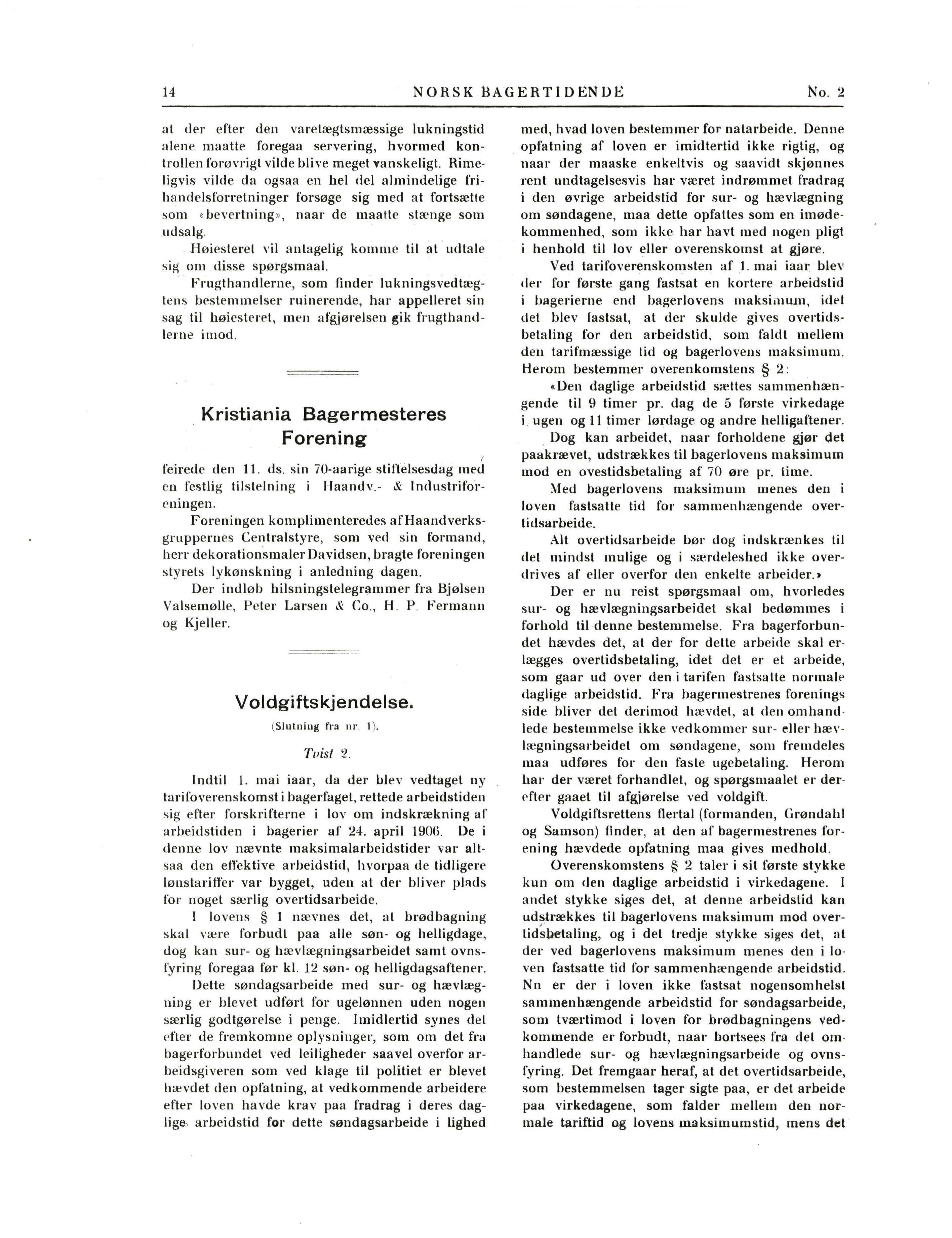 f'asts æ lter bagerloven ikke nogen afkortning paa grund af d elte arbeide, og dette arbeide synes heller ikke al kunne indgaa under bestemmelsen: «Arbeider, som paabegyndes før den ordinære arbeidstid » Delte udlryk nntages ni sigle pan det arb e ide, som efter loven udtrykkelig er lilladl umiddelbart før den ordinære arbeidstid (nalarbeide). Det synes saaledes som om der heller ikke fra bagersvendenes side har været gjort krav paa, al sur- og hævlægningsarbeidet om søndagene for fremtiden enten skulde betales extra eller afkortes i den øvrige arbeidstid, og dette bestyrker derfor endmere flertallets opfat • ning af tarifen , at sur- og hævlægningsarbeidel har , :æ ret holdt udenfor forhandlingerne Det kan ogsaa bemerkes, at den forøvrig i dette punkt ligelydende overenskomst , som er sluttet med Conditorsvend e nes forening, udtrykkelig er indtaget en bestemmelse om forhøiet overtidsbetaling fo1· søn- og helligdage. Dette forklares ved, at bagerloven forbyder søndagsarbeide kun for brødbagning, og al der i conditorier følgelig forekommer søndagsarbeide Bagersvendenes for. ening havde efter dette formentlig havt anledning til al være opmerksom særlig paa sur- og hævlægningsarbeidet om søndagene og til at forlange indtaget en bestemmelse om overtidsbetaling for deUe i tarifen, hvis de havde ønsket s~adan.