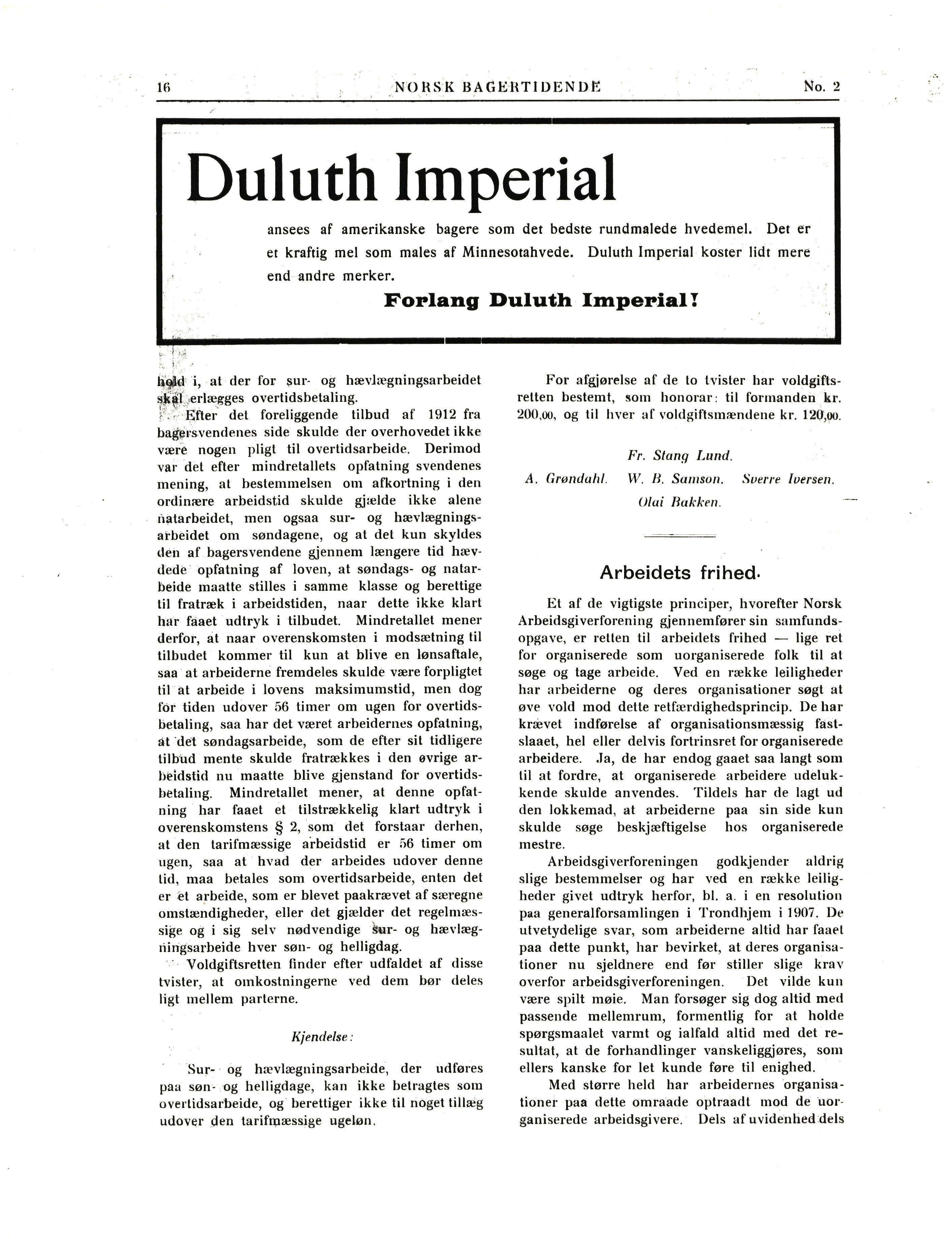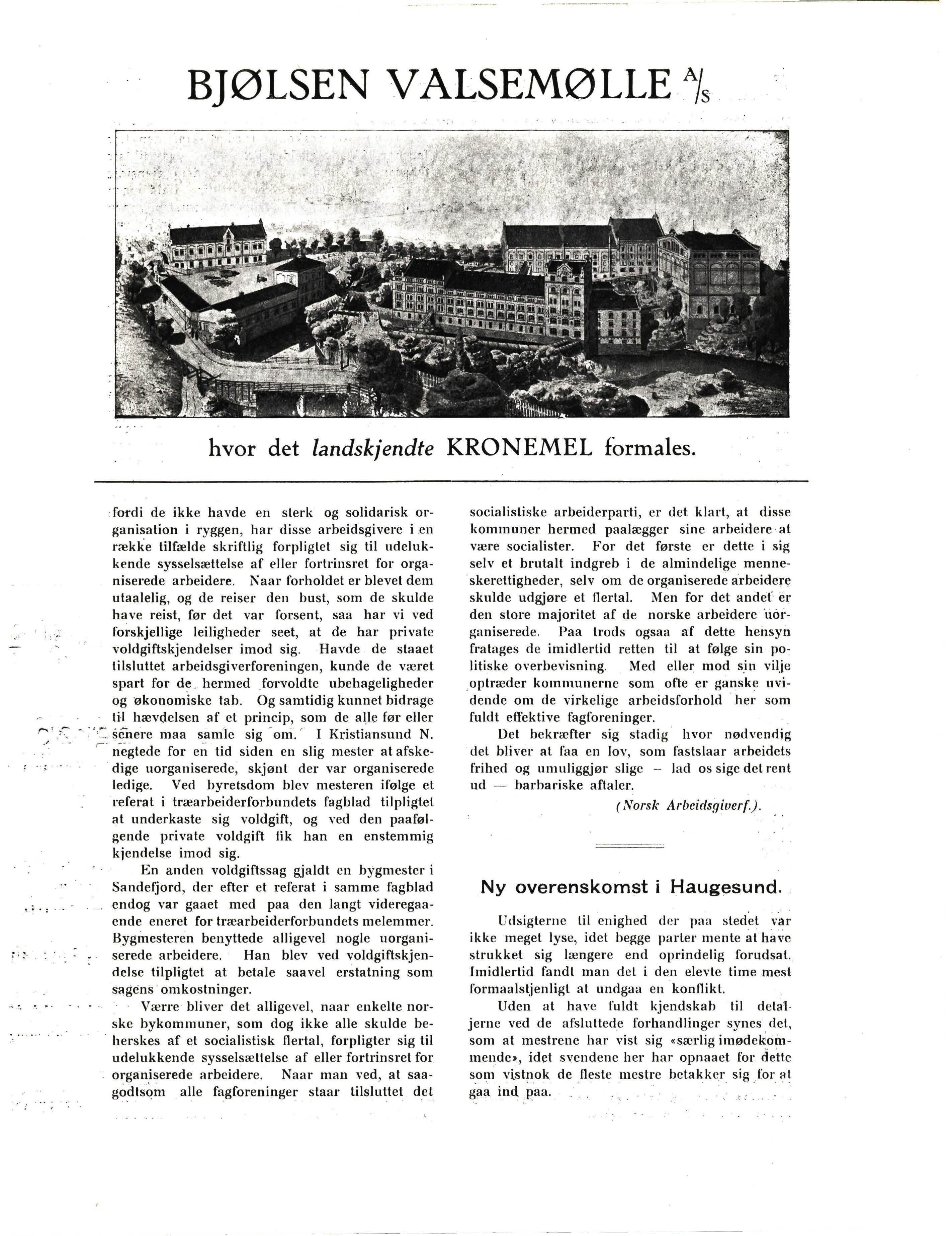 •fordi de ikke havde en sterk og solidarisk organisation i ryggen , har disse arbeidsgivere i en række tilfælde skriftlig forpliglel sig til udelukkende sysselsættelse af eller fortrinsret for organiserede arbeidere. Naar forholdet er blevet dem utaalelig, og de reiser den bust, som de skulde have reist, før det var forsent, saa har vi ved forskjellige leiligheder seet, at de har private voldgiftskjendelser imod sig. Havde de slaaet tilsluttet arbeidsgiverforeningen, kunde de været spart for d~ , hermed forvoldte ubehageligbeder og ·økonomiske tab. Og samtidig kunnet bidrage til hævdelsen af et princip, som de aU e før eller - >: senere maa sam1e sig -om. ' I Kristiansund N. ' neglede for e11 tid siden en slig mester at afskedige uorganiserede, skjønt der var organiserede ledige. Ved byretsdom blev mesteren ifølge et referat i træarbeiderforbundets fagblad tilpligtel at underkaste sig voldgift, og ved den paafølgende private voldgift fik han en enstemmig kjendelse imod sig.