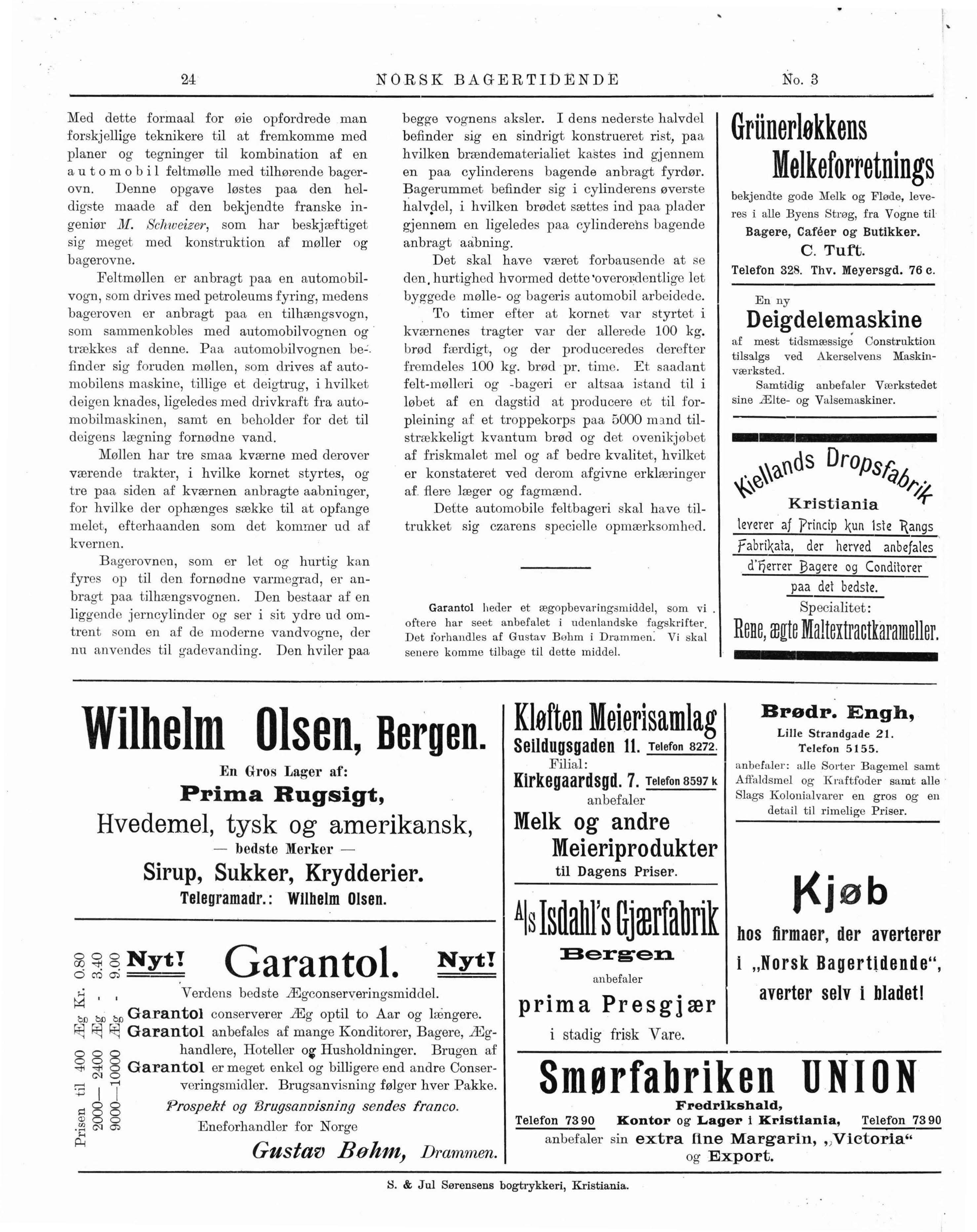 Vi vil minde om , at medfemmerne af vor organisation faar bladet gratis. Dette er kun muligt derved at der serges for en stadig tilgang paa betalte aver tissementer . Serg for, at Eders leverande,:er af me l, gjær , s mer , margarin , æg, melk, kolonialvarer, redskaber , papir osv . averterer i " NORSK BAGER TIDENDE".