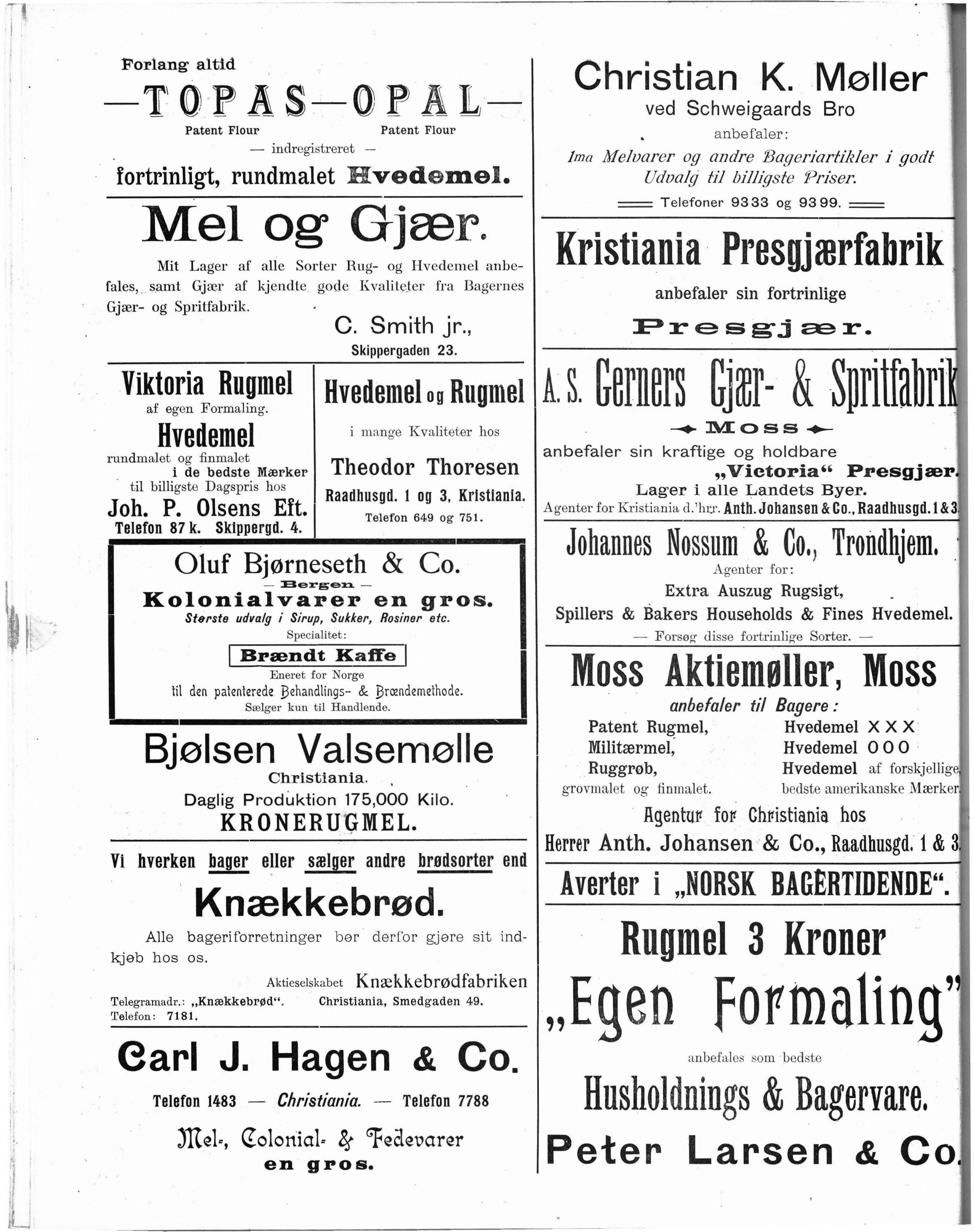 Mit L a ge r af a ll e Sorte r Ru g- og H ve d e m el a nb efales , samt Gj ~ r af kj e ndt e gode Kva lit eJe r fra Bagernes Gjær- og Spritfabrik.