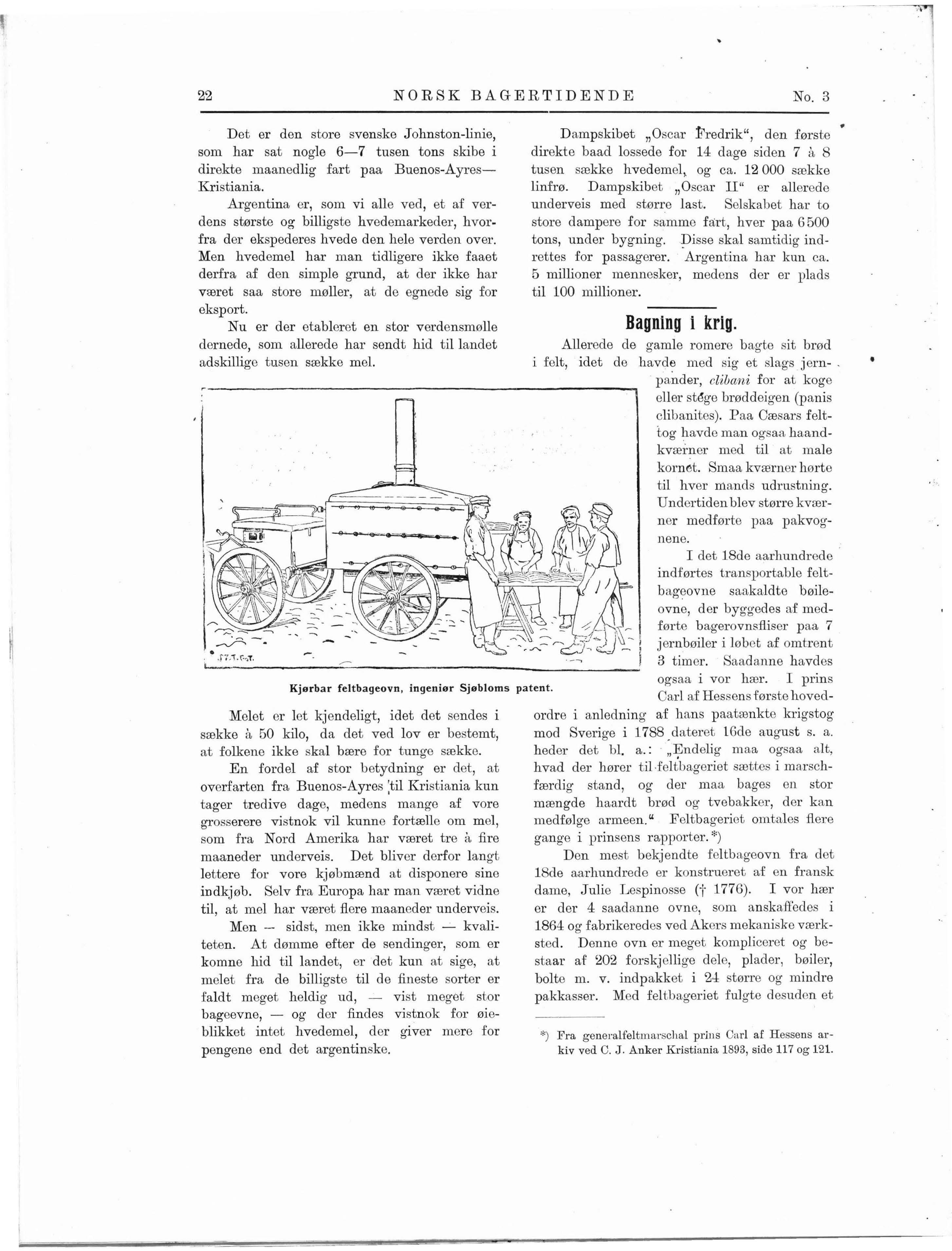 Det skal have v æ ret forbausend e at se d en , hurtigh e d hvormed d ette ·overor:dentli ge l et bygg e d e mølle- o g bageris automobil arbeidede. T o tim e r efter at kornet v a r s tyrtet i kv æ rn e nes tragte r var der a ll erede 100 kg brød f ærdigt, og der produc e red es d er ef t e r fremde l es 100 kg. brød pr. time Et saadant felt-møll eri og -bag e ri e r a ltsaa i sta nd til i løb e t af en dagstid a t producer e et til forpleining af et troppekorp s p aa 6000 mmd tilstr ækkeligt kvantum brød og d et ovenikjøbet af friskmalet mel og af bedre kvalitet, hvilk e t er konstateret ved derom afgivn e erk l ærin ge r af. fler e læger og fagmænd.