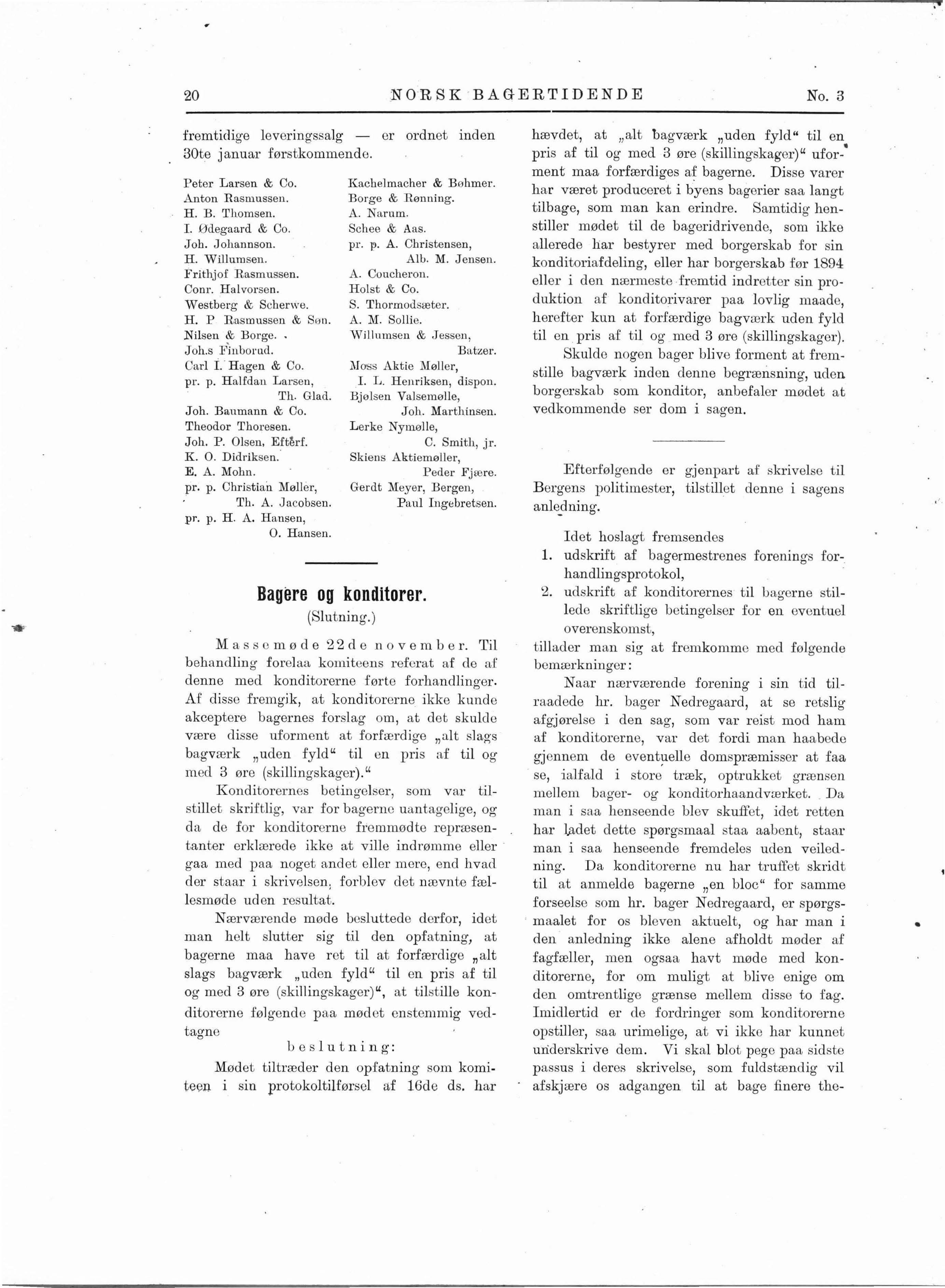 N ærv ær e nd e møde beslutted e d erfor, id et man h elt slutte r sig til den opfatning, at bagerne maa hav e r e t til at forfærdig e "alt slags bagv ærk "uden fyld" til en pri s af til og m e d 3 øre (s killingska ger) ", a t tilsti ll e konditor erne fø l ge nd e p aa mød et enstemmig vedtagne