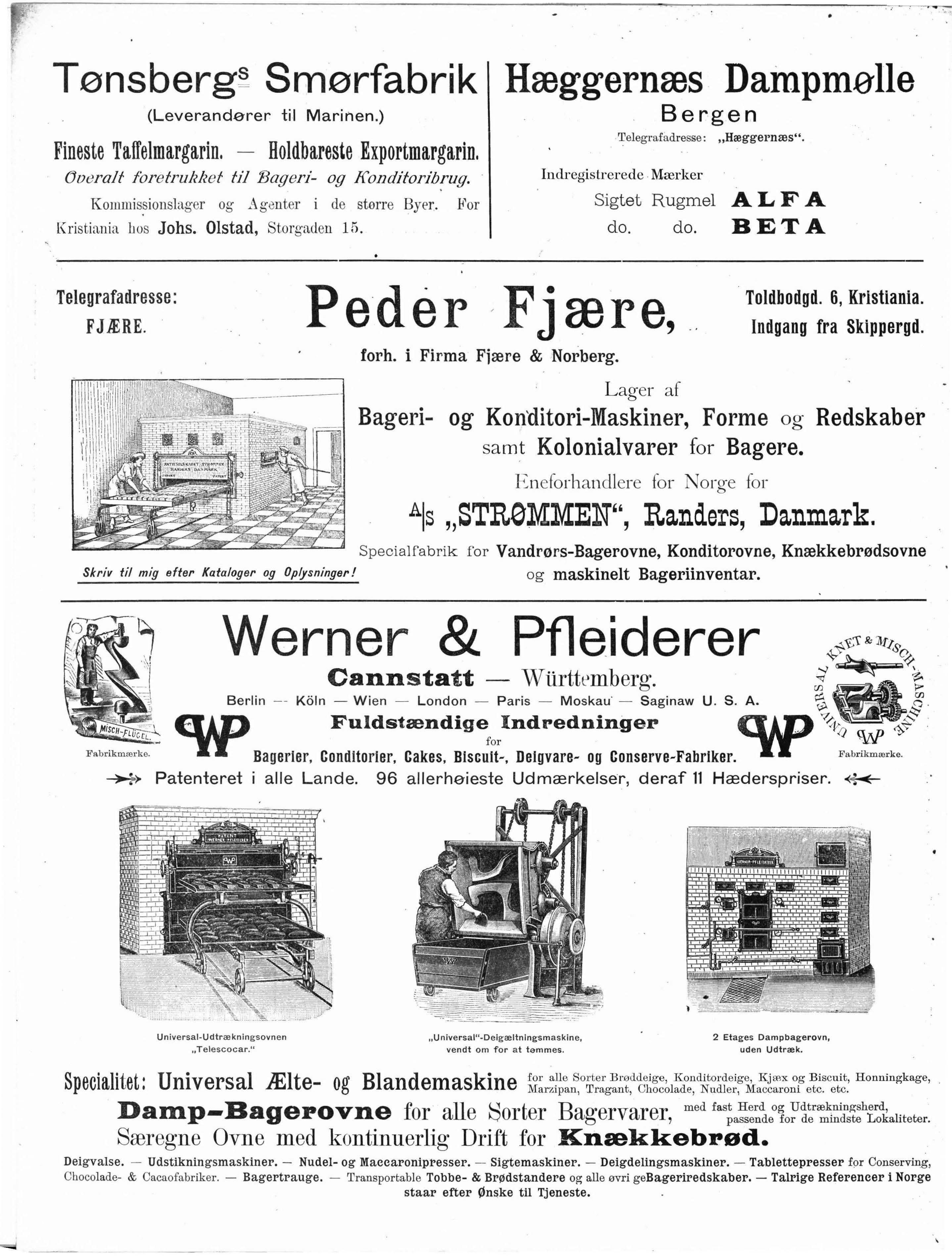 Dei gvalse - Udstiknin gs maskiner. - Nudel- og Maccaronipresser. - Sigtemaskiner. - Deigdelingsmaskiner. - Tablettepresser f9r Conse r ving, Choco lad e- & Cacaofabriker - Bagertrauge. - Transportable Tobbe- & Brødstandere og alle øvri ge Bageriredskaber. - Talrige Referencer i Norge staar efter Ønske til Tjeneste.