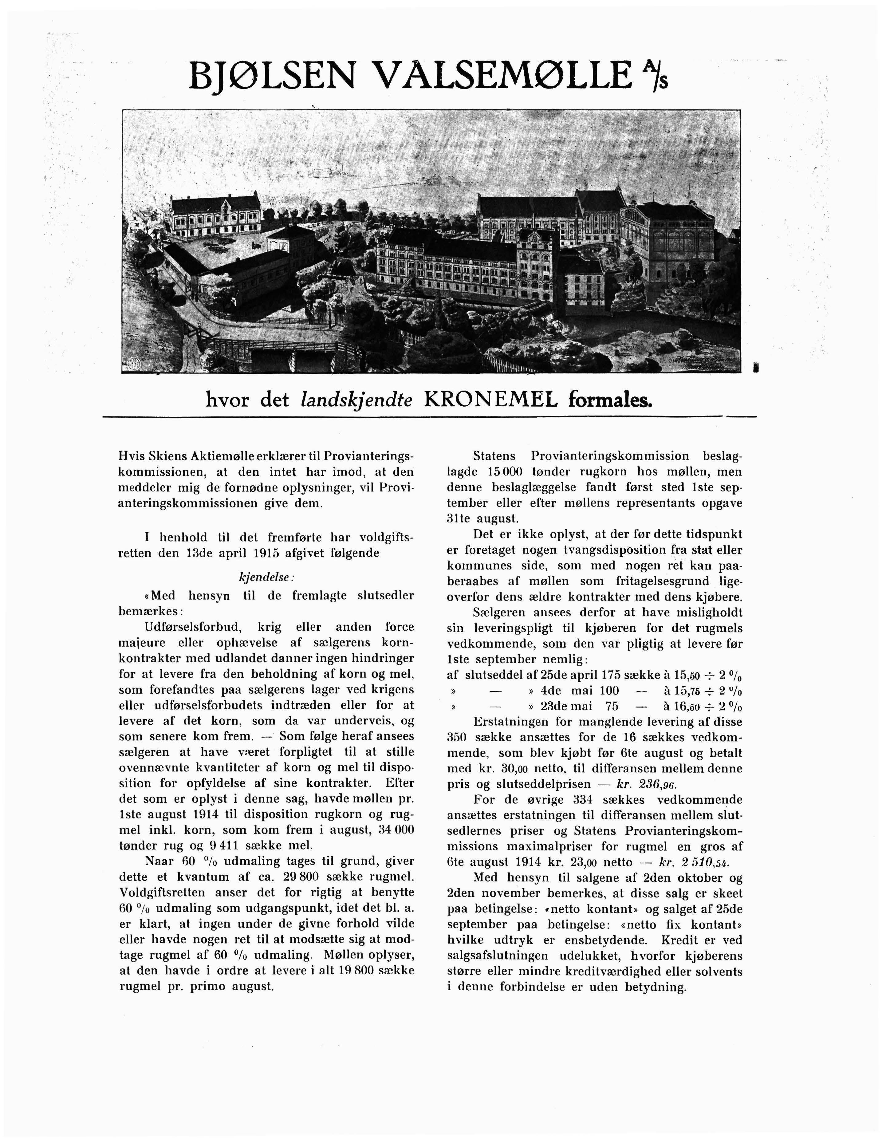 at den havde mere end tilslrækkeligl lil al opfylde kontrakten med Rolfsen & Co , som formentlig var en af de tidligste, maa være ganske utvivlsoIJlt. Dertil kommer, at møllen efter hvad der er mig meddelt, hadde svømmende ladninger. For hele sin beholdning fik møllen en pris af mindst kr. 30,oo, se de fremlagte regninger, og kr. 23,oo. Denne store gevinst finder møllen det retfærdigt at berøve konsumenterne og beholde selv. Jeg haaber, voldgiftsretten vil vise møllen, at det ikke er den almindelige opfatning . Der siges, at møllen paa denne «job » skal have tjent mellem 6 a 800 000 kr.
