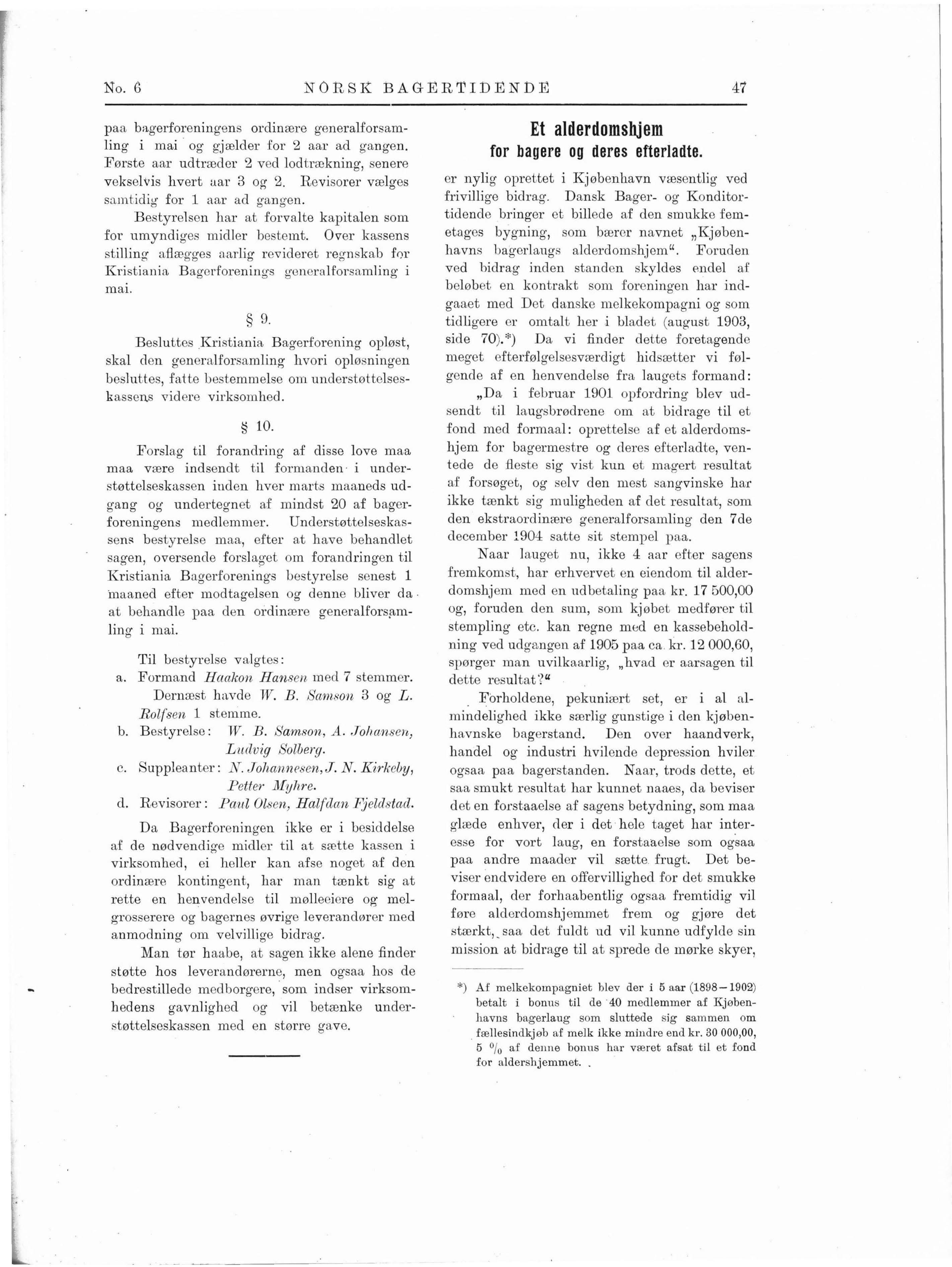 er nylig opr et tet i Kjøbenhavn væs entlig ved frivillig e bidrag. Dansk Bager- og K o nditortidend e bring er e t bill e de af d en smukk e femetag es bygning, so m b ære r navnet "Kjøbenhavn s bagerlang s ald erdom shjem". F oruden ved bidrag ind en standen sky ld es Emdel af b eløb et en kontrakt so m foreningen h a r indga ae t m e d D e t dan sk e melkekompagni og som tidligere er omtalt h er i blad et (august 1903, side 70). *) Da vi finder dette foret a gend e m ege t efterfølg el sesvæ rdigt hid sæt ter vi følgencle af e n h e nv e nd els e fr a lau gets formand: ,,D a i f ebruar 1901 opfordring blev udse ndt t il l a ug sbrødr e ne om at bidrag e til et fond med formaal: opret tel se af et a ld erdomshj em for bagerme st re og d ere s efterlaclte, ventede d e fl este s ig vist kun et ma ge rt resultat af forsøget, og selv den m es t sa ngvinske h ar ikke tænkt sig muligh ed en a f elet resultat, som den ekstraordinær e genera lforsamlin g den 7de d ece mb er 1904 satte s it stempel paa.