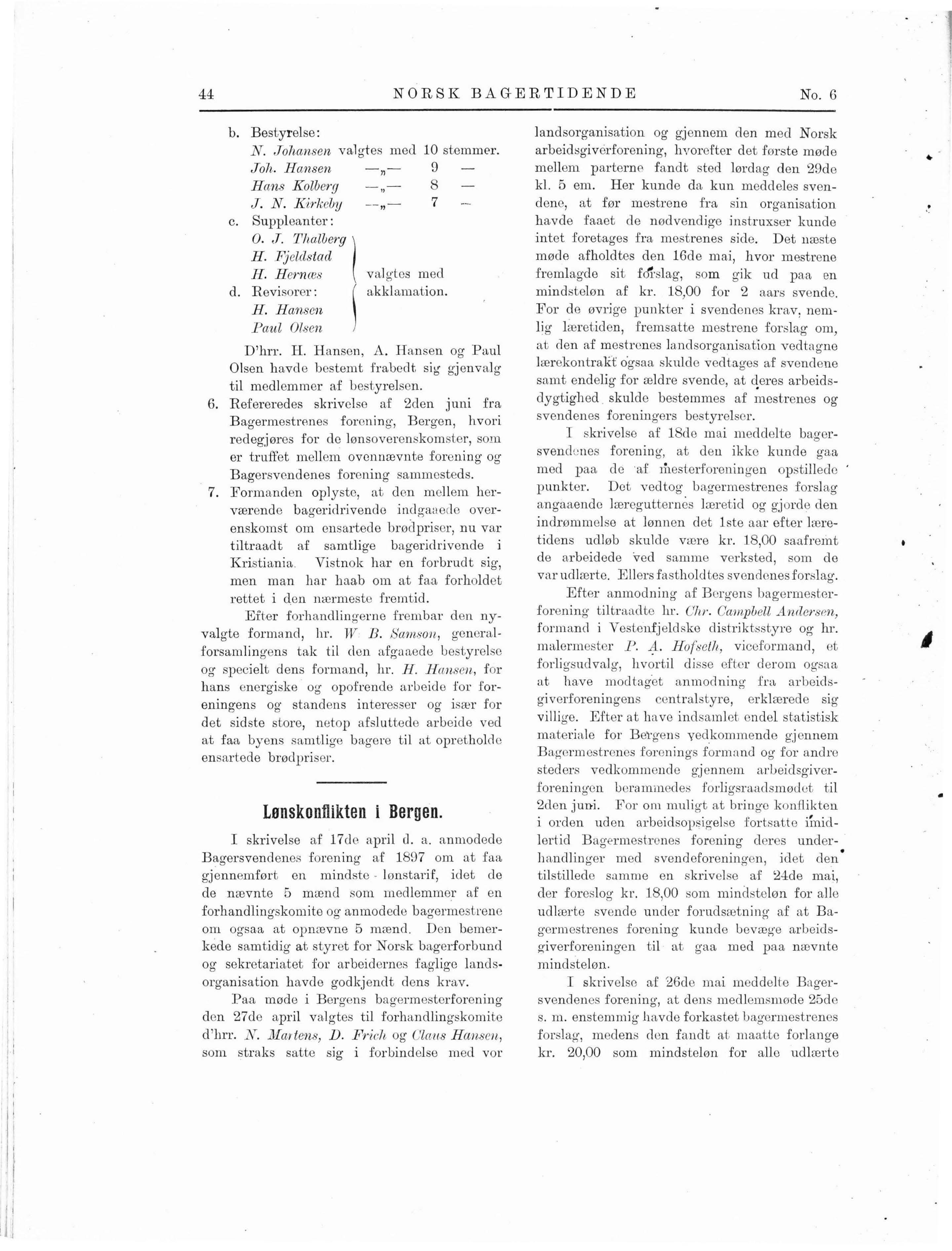 Bagerm.estr en es forenings r e præ se ntanter, N. Mart ens, Cla11s :Ha ns en og D. Frich, bagers vendenes repræs entanter Sc haatlmn, Rasmusse1i, W. Olsen og Nygaard samt arb eidsgiverforeni ngo n s r epr æse nt an ter Chr. Campbell .Andersc n og P. A Hofseth bl e v der e ft e r m ege n <l e bat foroshaet af Chr. Oam pbell Andersen en rnind s teløn af kr. 18,00 for de to før s te sven<leaar samt kr . 20,00 for ele se n er e aar. Nyg aa rd for eslog h. 18,00 for d et første aa.r sa mt h. 20,00 for de øvrig e aar. N. Marteris for es lo g senere kr. 18 ,00 d et før s te aa r, kr. 19,00 d e t andet aar samt kr. 20,00 for d e øvrige aar.