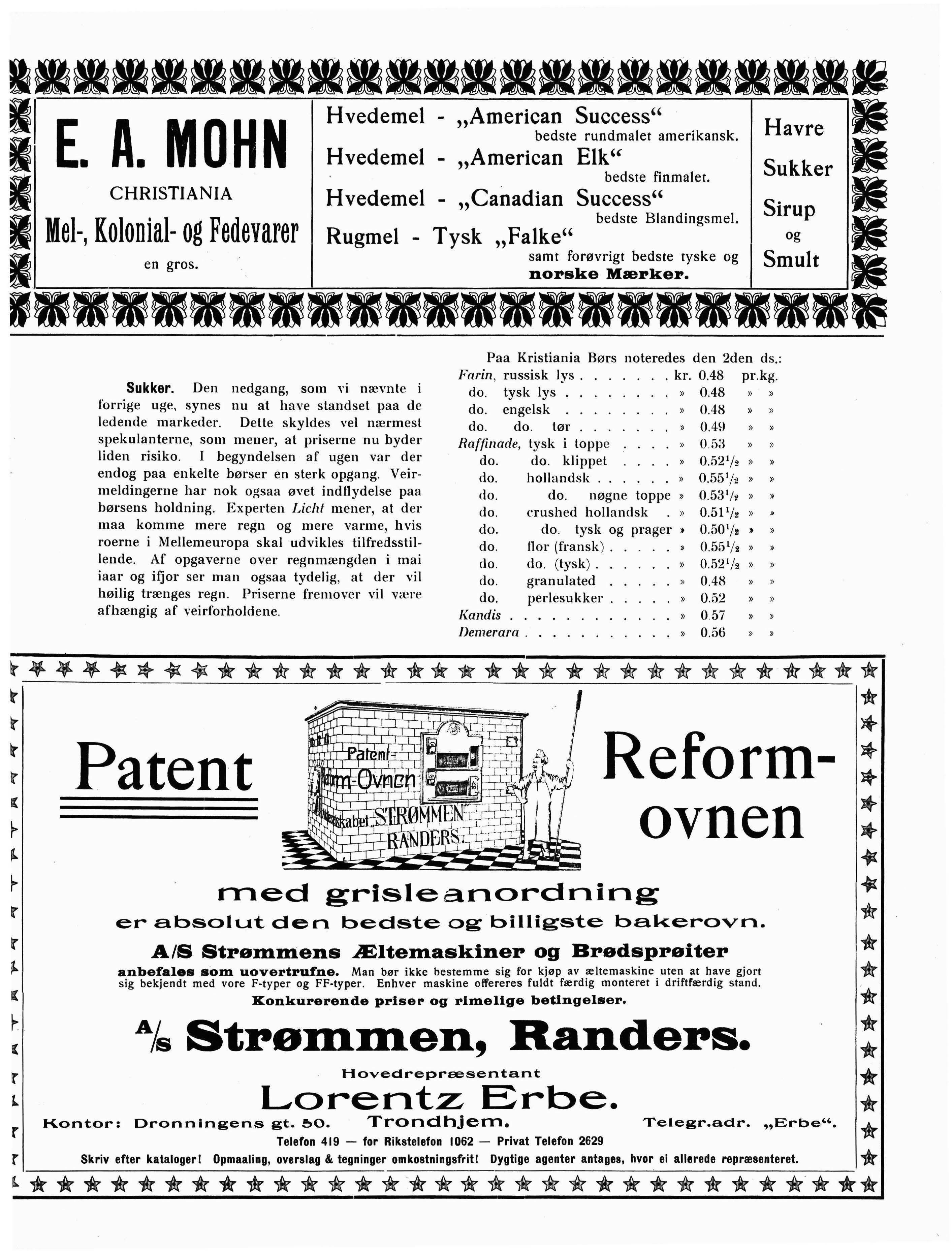 Sukker. Den nedgang, som vi nævnte i forrige uge, synes nu at have standsel paa de ledende markeder. Dette skyldes vel n æ rmest spekulanterne, som mener, at priserne nu byder tiden risiko I begyndelsen af ugen var der endog paa enkelte børser en sterk opgang. Veirmeldingerne har nok ogsaa øvet indflydelse paa børsens holdning. Experten Licht mener, at der maa komme mere regn og mere varme, hvis roerne i Mellemeuropa skal udvikles tilfredsstillende. Af opgavern e over regnmængden i mai iaar og ifjor ser man ogsaa tydelig , at der vil høilig trænges regn. Priserne fremover vil være afhængig af ve irforholdene