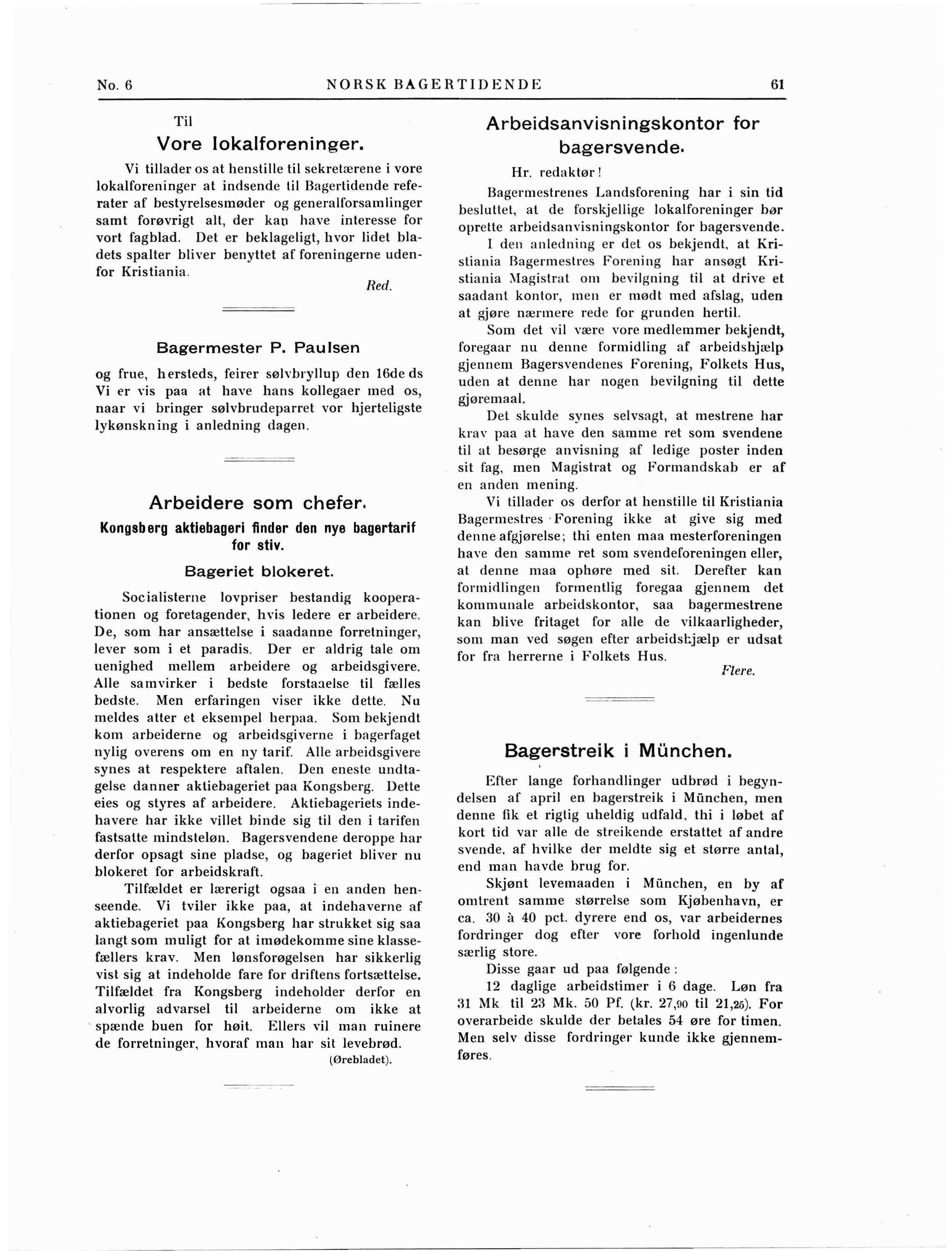 Vi tillader os at henstille til sekretærene i vore lokalforeninger at indsende til Bagertidende referater af bestyrelsesmøder og generalforsamlinger samt forøvrig! alt, der kau have interesse for vort fagblad. Det er beklageligt, hvor lidet bladets spalter bliver benyttet af foreningerne udenfor Kristiania. Red.