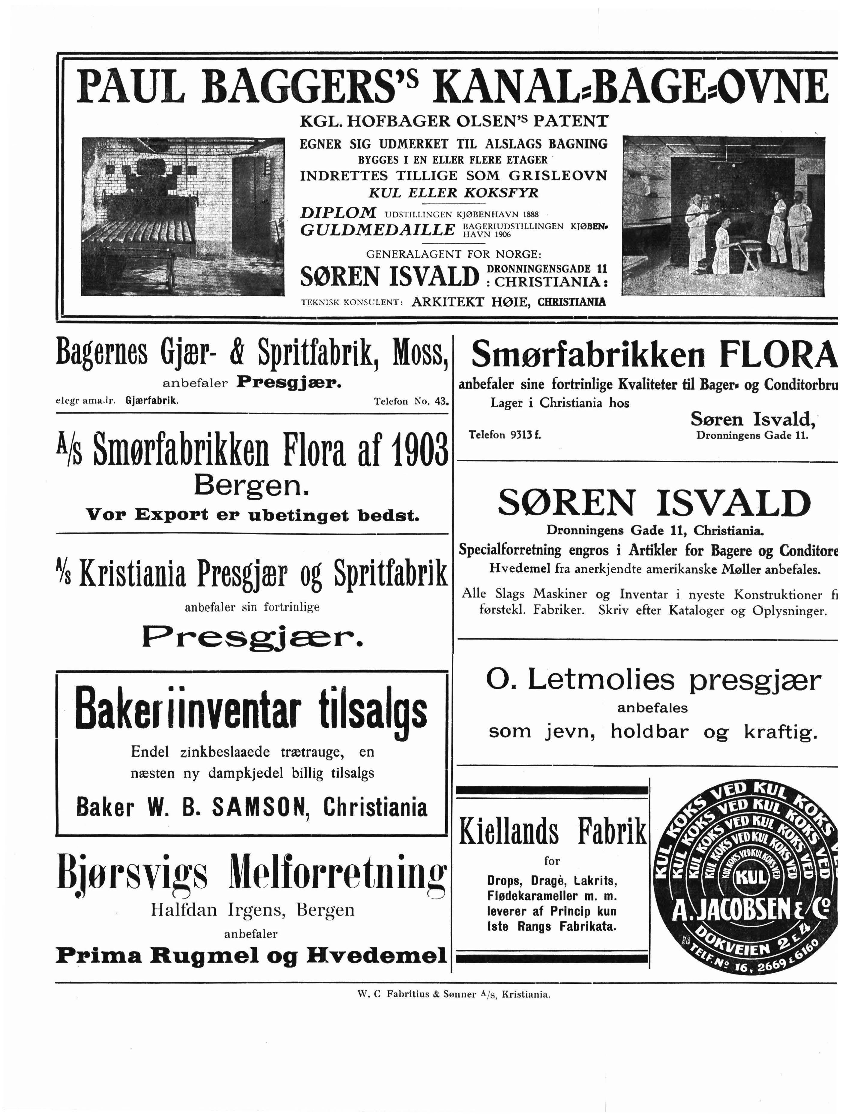 Specialforretning i alle Slags Maskiner og Redskaber for Bage Konditorier, Chocoladefabriker og Dropsfabriker. Altid a jour med det nyeste paa Bageriteknikens Omraade. Paa lager haves stadig :