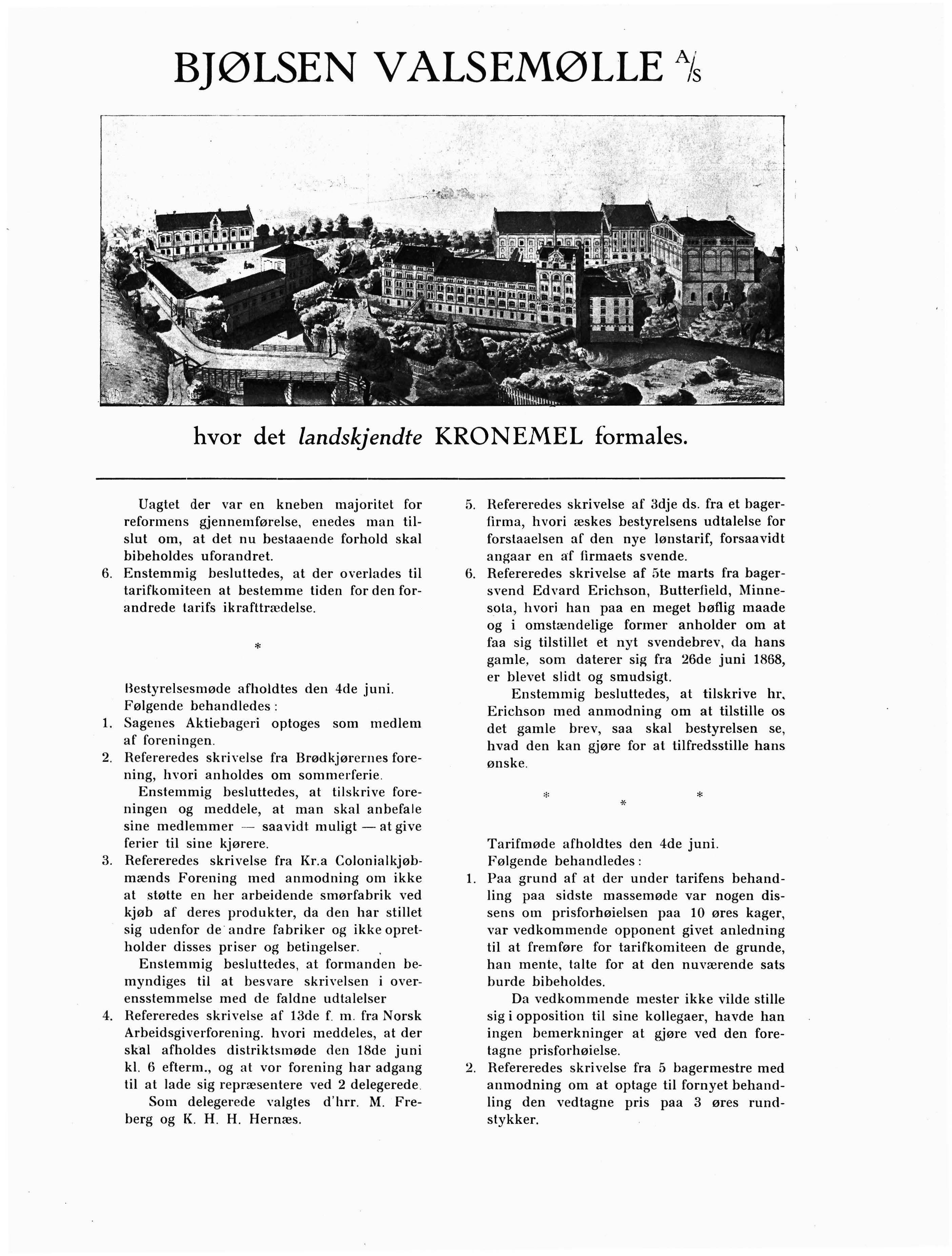 Kornmarkedet (meddelt ved Bjølsen Valsemølle, den 18de juni 1913) Siden vor sidste maanedsoversigt har markedet gjennemgaaende forholdt sig noksaa rolig Selvfølgelig har der været visse svingninger. baade op og ned, saaledes som altid er tilfældet med en saa letbevægelig vare som korn, men nogen afgjørende niveauforandring i prisernc er ikke indtraadt. Hvad rugen angaar, synes det, som man baade i Tyskland og Rusland nærer forhaabninger om en tilfredsstillende høst, for Tysklands vedkommende kanske nærmest et gjennemsnitsudbytle. Rusland er det altid vanskeligere at bedømme, idet forholdene der ikke er saa veloi:dnede, men mange antager, at høsten der , hvis den holder, hvad den nu lover, vil falde ud noget større end gjennemsnitlig Under disse omstændigheder er kjøberne endnu meget tilhageholdne, idet sælgerne paa sin side heller ikke foreløbig er tilbøielig til indrømmelser Rugmelsforretningerne afvikles derfor mest for dagen. H vad hveden angaar, synes det ogsaa , som Rusland kan vente sig et godt udbytle Fra Amerika er efterretningerne mere modsigende, hvilket afspeiler sig i de amerikanske børsers noteringer, som ofte svinger sterkt og pl udselig Gjennemgaaende gjøres derfor ogsaa de fleste hvedemelsforretninger kun paa kort tid fremover Enkelte kvaliteter, der til sine tider har ligget noget lavere, har dog været omsat paa lidt længere levering. Situationen paa hvedemarkedet synes i det hele noget vanskeligere at bedømme, særlig fordi Amerika er saa variabel.