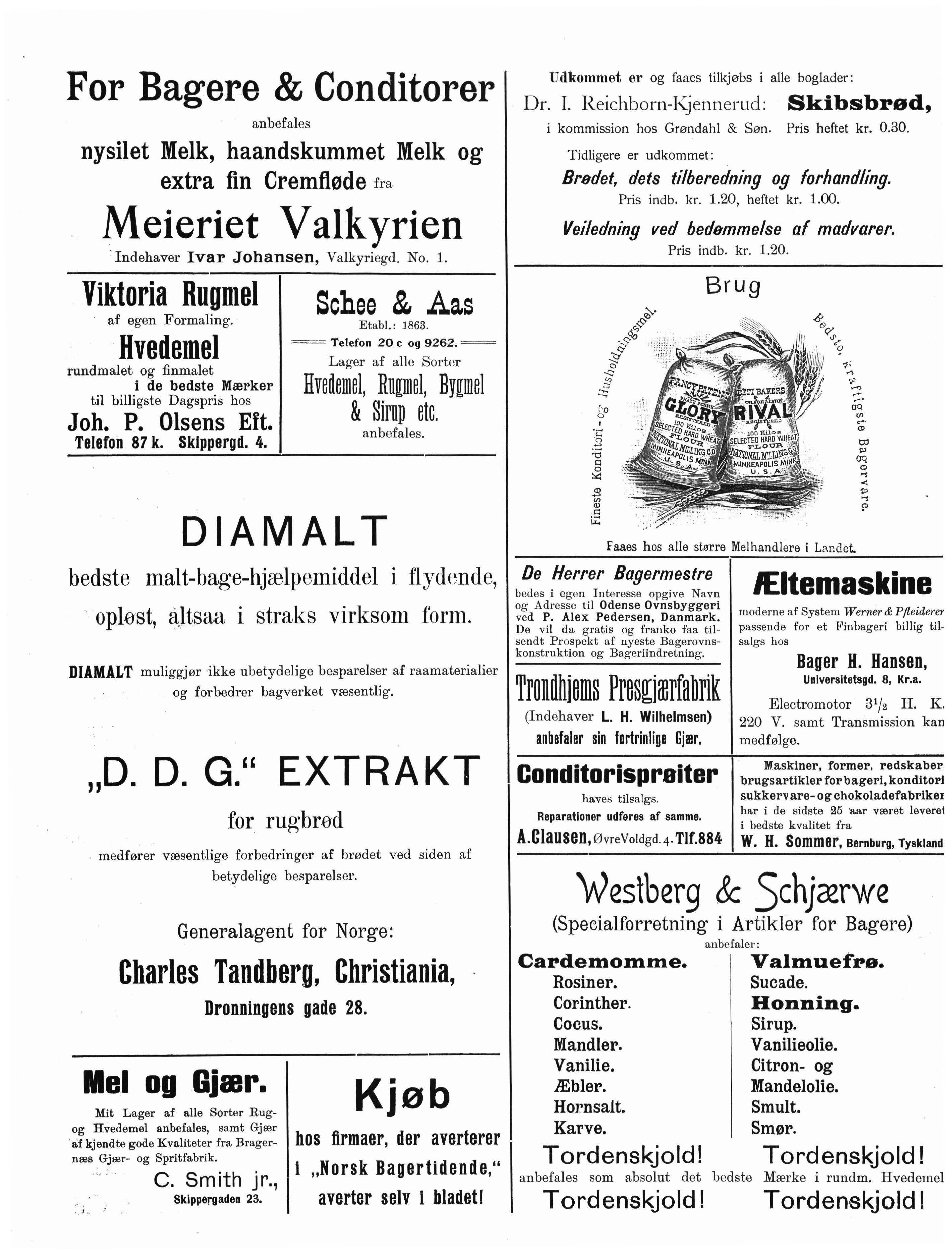 Vi vil minde om, at medfemmerne af vor organisation faar 6/adet gratis. Dette er kun muligt derved at der sørges for en stadig tilgang paa betalte avertissementer. Sørg for, at Eders leverandører af mel, gjær, smør, margarin, æg, melk, kolonialvarer, redskaber papir osv. averterer i "NORSK BAGERTIDENDE".
