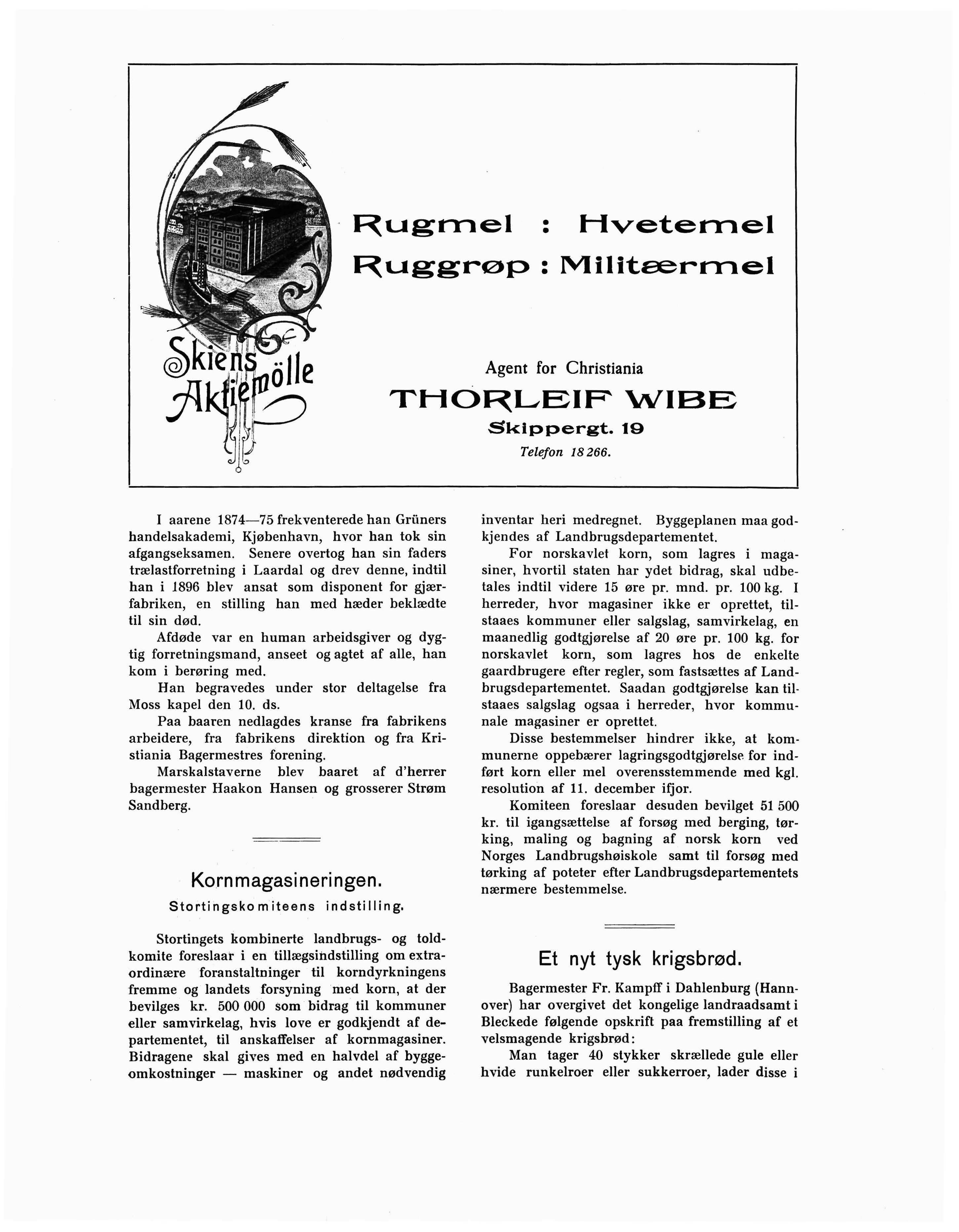 Stortingets kombinerte landbrugs- og toldkomite foreslaar i en tillægsindstilling om extraordinære foranstaltninger til korndyrkningens fremme og landets forsyning med korn, at der bevilges kr. 500 000 som bidrag til kommuner eller samvirkelag, hvis love er godkjendt af departementet, til anskaffelser af kornmagasiner. Bidragene skal gives med en halvdel af byggeomkostninger - maskiner og andet nødvendig
