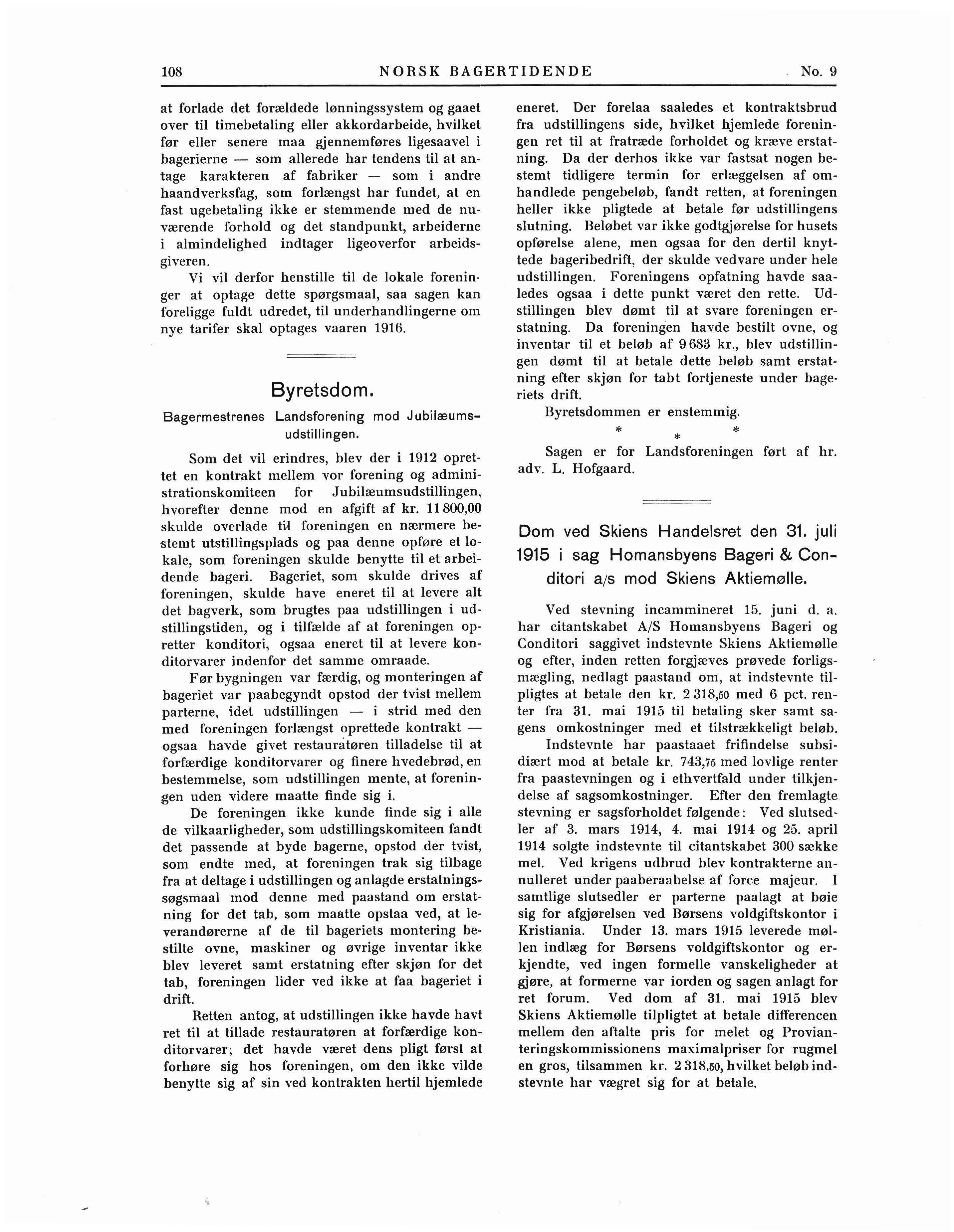 Dom ved Skiens Handelsret den 31. juli 1915 i sag Homansbyens Bageri & Conditori a;s mod Skiens Aktiemølle.