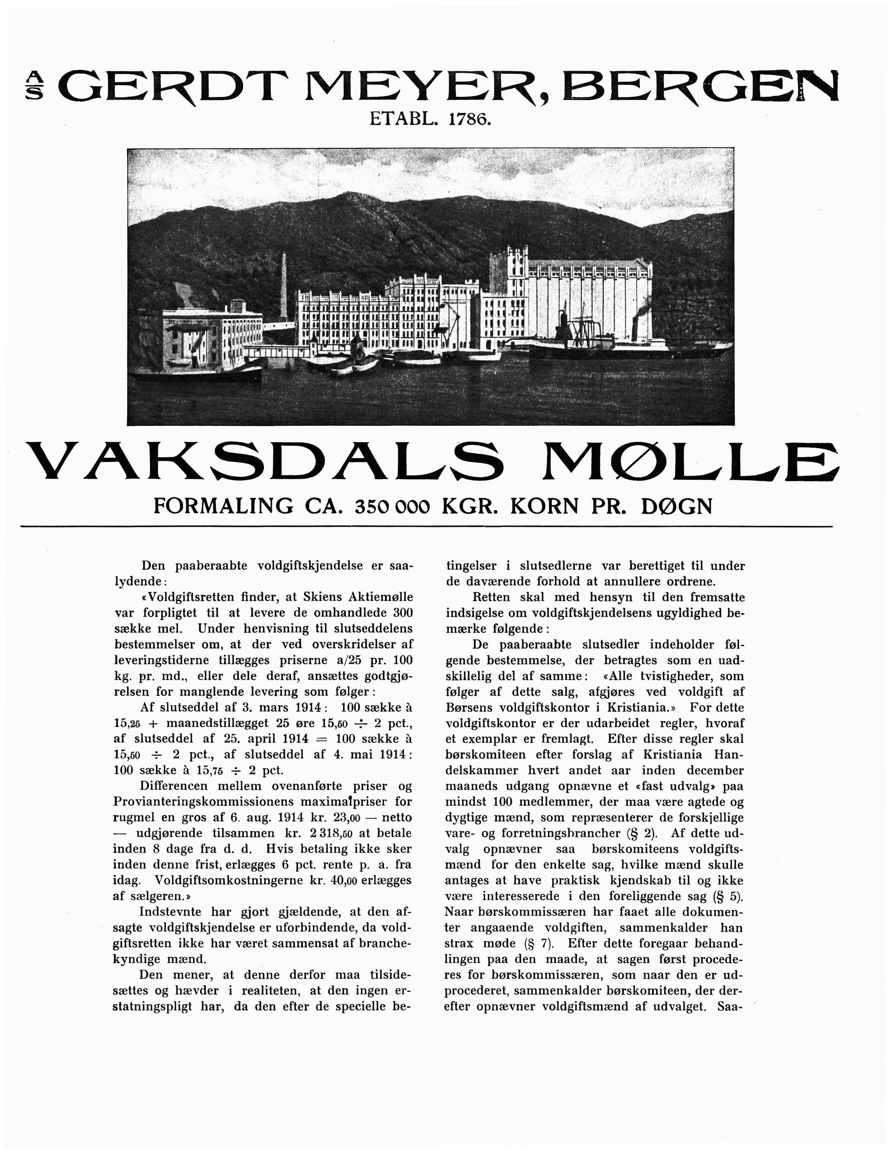 « Voldgiftsretten finder, at Skiens Aktiemølle var forpligtet til at levere de omhandlede 300 sække mel. Under henvisning til slutseddelens bestemmelser om, at der ved overskridelser af leveringstiderne tillægges priserne a / 25 pr. 100 kg. pr. md., eller dele deraf, ansættes godtgjørelsen for manglende levering som følger :