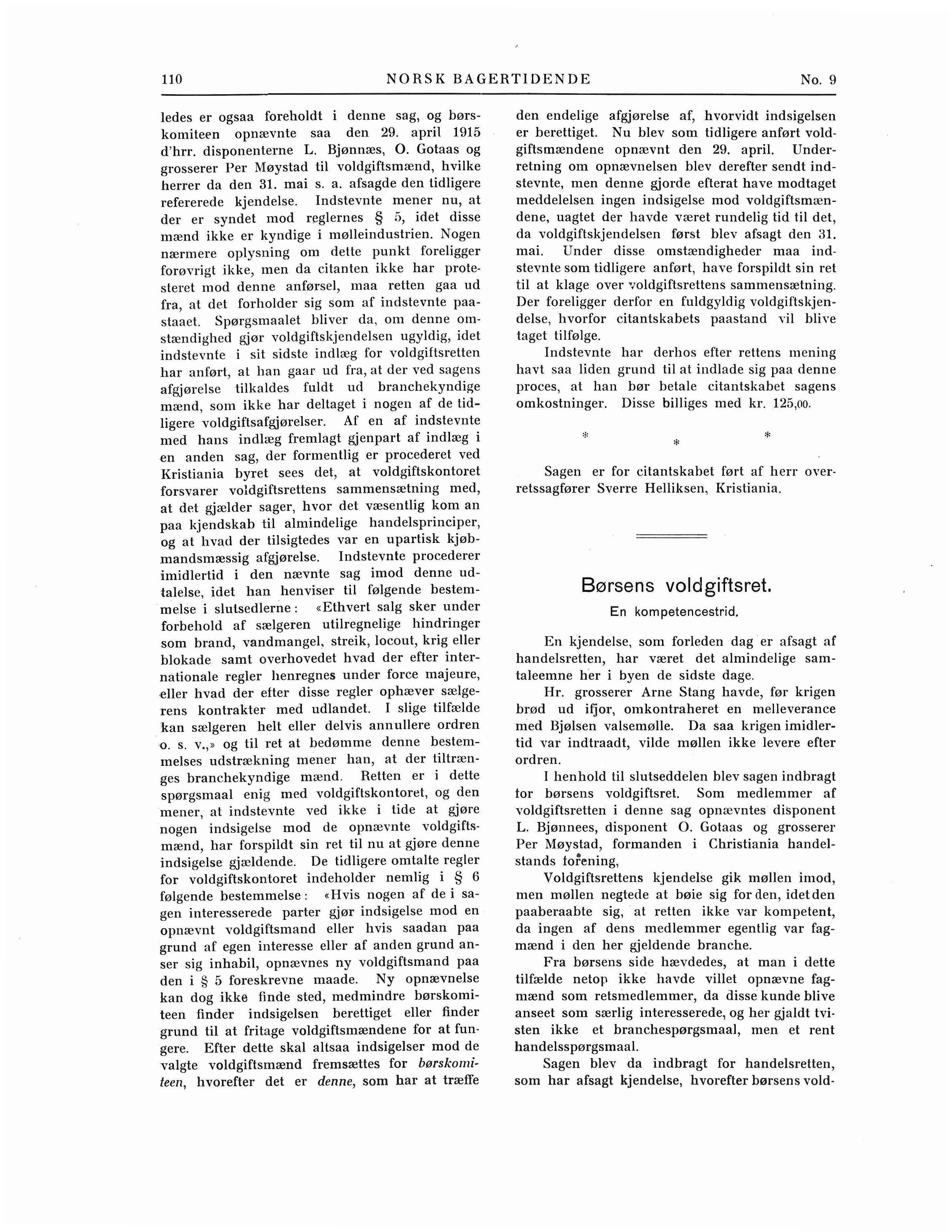 ledes er ogsaa foreholdt i denne sag, og børskomiteen opnævnte saa den 29. april 1915 d'hrr. disponenterne L. Bjønnæs, 0. Gotaas og grosserer Per Møystad til voldgiftsmænd, hvilke herrer da den 31. mai s. a. afsagde den tidligere refererede kjendelse. lndstevnte mener nu, at der er syndet mod r~glernes § 5, idet disse mænd ikke er kyndige i mølleindustrien. Nogen nærmere oplysning om dette punkt foreligger forøvrigt ikke, men da citanten ikke har protesteret mod denne anførsel, maa retten gaa ud fra, at det forholder sig som af indstevnte paastaaet. Spørgsmaalet bliver da, om denne omstændighed gjør voldgiftskjendelsen ugyldig, idet indstevnte i sit sidste indlæg for voldgiftsretten har anført, at han gaar ud fra, at der ved sagens afgjørelse tilkaldes fuldt ud branchekyndige mænd, som ikke har deltaget i nogen af de tidligere voldgiftsafgjørelser. Af en af indstevnte med hans indlæg fremlagt gjenpart af indlæg i en anden sag, der formentlig er procederet ved Kristiania hyret sees det, at voldgiftskontoret forsvarer voldgiftsrettens sammensætning med , at det gjælder sager, hvor det væsentlig kom an paa kjendskab til almindelige handelsprinciper, og at hva,d der tilsigtedes var en upartisk kjøbmandsmæssig afgjørelse. lndstevnte procederer imidlertid i den nævnte sag imod denne udtalelse, idet han henviser til følgende bestemmelse i slutsedlerne: «Ethvert salg sker under forbehold af sælgeren utilregnelige hindringer som brand, vandmangel, streik, locout, krig eller blokade samt overhovedet hvad der efter internationale regler henregnes under force majeure, ,eller hvad der efter disse regler ophæver sælgerens kontrakter med udlandet. I slige tilfælde kan sælgeren helt eller delvis annullere ordren o. s v.,» og til ret at bedømme denne bestemmelses udstrækning mener han, at der tiltrænges branchekyndige mænd . Retten er i dette spørgsmaal enig med voldgiftskontoret, og den mener, at indstevnte ved ikke i tide at gjøre nogen indsigelse mod de opnævnte voldgiftsmænd, har forspildt sin ret til nu at gjøre denne indsigelse gjældende. De tidligere omtalte regler for voldgiftskontoret indeholder nemlig i § 6 følgende bestemmelse : «Hvis nogen af de i sagen interesserede parter gjør indsigelse mod en opnævnt voldgiftsmand eller hvis saadan paa grund af egen interesse eller af anden grund anser sig inhabil, opnævnes ny voldgiftsmand paa den i § 5 foreskrevne maade Ny opnævnelse kan dog ikke finde sted, medmindre børskomiteen tinder indsigelsen berettiget eller finder grund til at fritage voldgiftsmændene for at fungere. Efter dette skal altsaa indsigelser mod de valgte voldgiftsmænd fremsættes for børskomiteen, hvorefter det er denne, som har at træffe