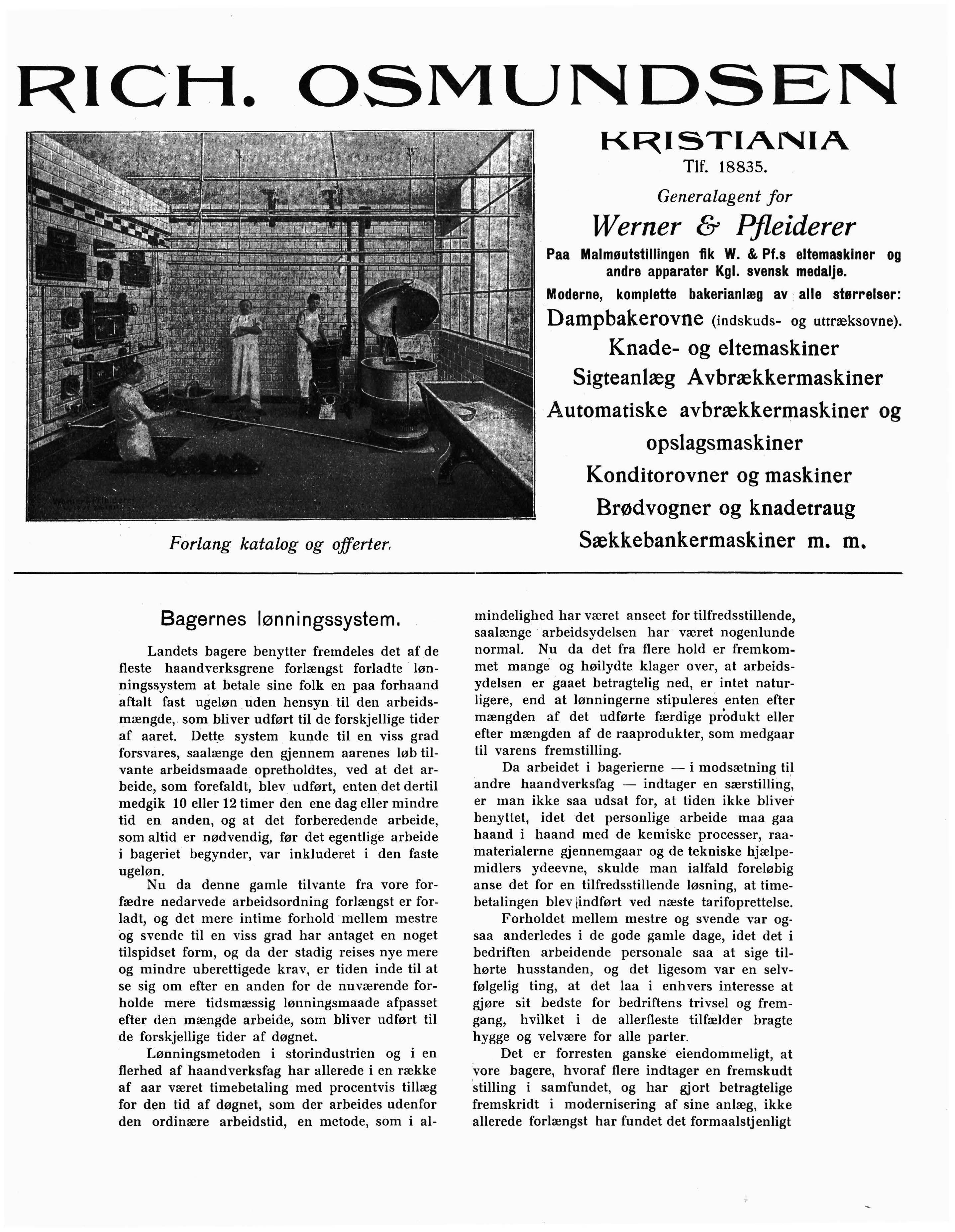 1 Leverer og opstiller i fuldendt Konstruktion og i solid, gedigen Udførelse samt under vidtgaaende Garanti: Inskuds-, Udtræks- og Kombinations -Dampbakerovne i alle Størrelser, Konditor-Dampbakerovne, Kjedeovner, Kavring-Røstovn osv. Deigæltemaskiner, Deigveie-, Dele- og Virkmaskiner, Sneslagmaskiner, Melblande- og Sigtemaskiner, Deigvalseverk osv., samt alleslags Artikler for Bakerier og Konditorier.