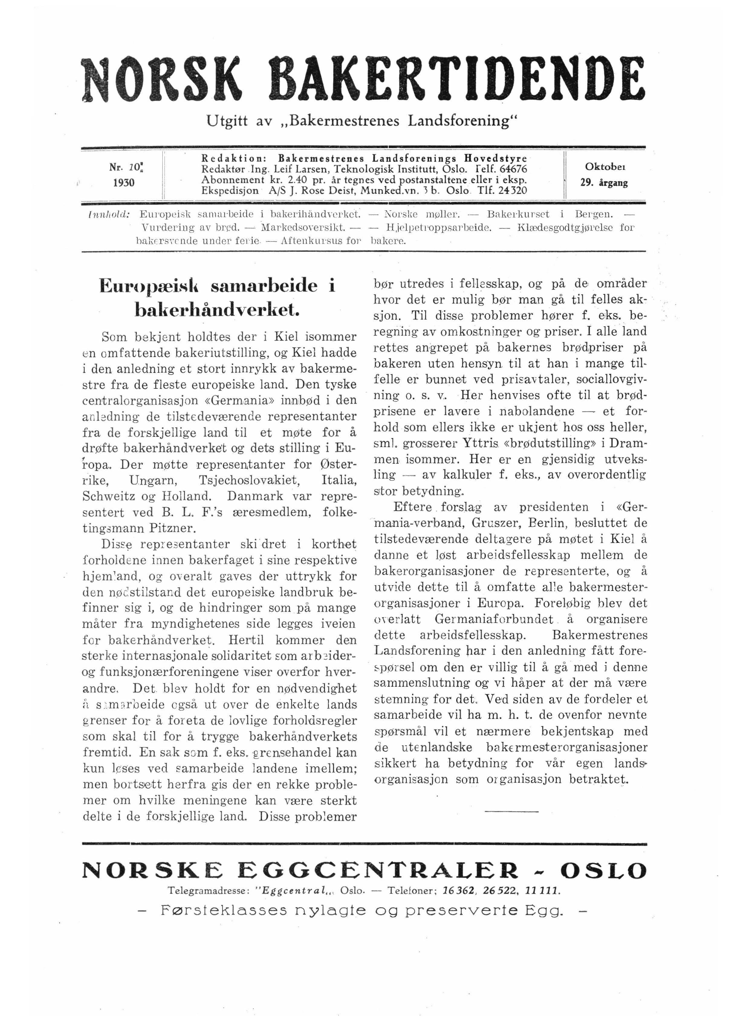Eftere forslag av presidenten i «Gerin,ania-verband, Gruszer, Berlin, besluttet de tilstedevære-nde delta ge re på m øtet i Kiel å danne et løst arb eidsfe lles3k a.p mellem de bakerorganisasjoner de r e prese nterte, og å utvide dette til å omfatte al1e bakermesterorganisasjoner i Europa Foreløb ig blev det OY 'e r latt Germaniaforbundet . å organisere dette arbeids.fellesskap. Bakermestrenes Landsforening har i den anledning fått fore!:' pørsel om den er villig til å gå med i denne sammenslutning og vi håper at der må være stemning for det. Ved siden av de fordeler et samarbeide vil ha m. h. t. de ovenfor nevnte spørsmål vil et nærmere bekjentskap med de utenlandske bakumesterorganisasjoner sikkert ha betydning for vår egen lands• organisasjon som organisasjon betr.aktet.