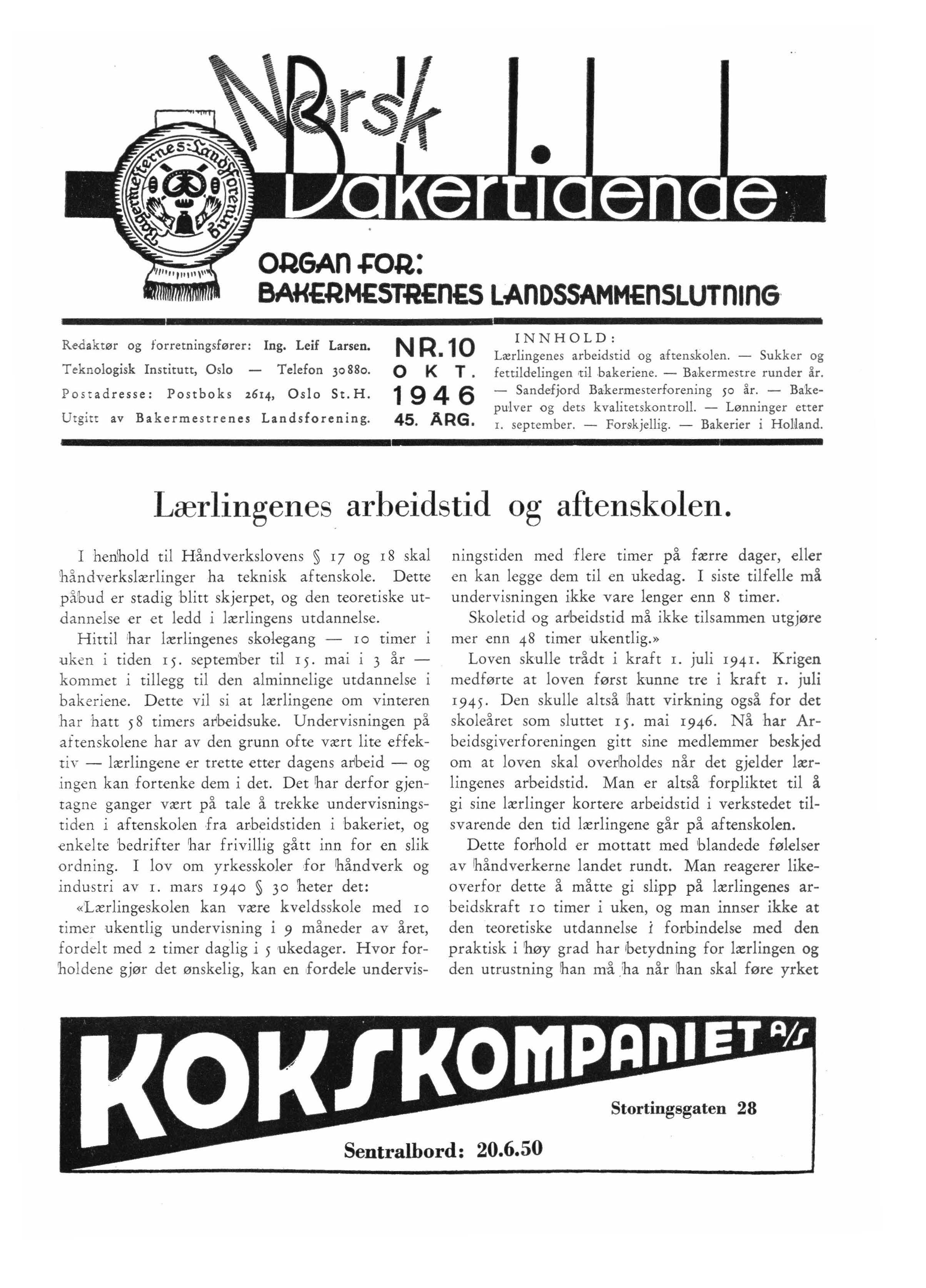 Lærlingenes arbeidstid og aftenskolen. - Sukker og fettildelingen ;ril bakeriene. - Ba,kermestre runder år. - Sandefjor,d Ba-kermesterforening 50 k - Bakepulver o g dets kvalitetskontroll. - Lønn inger etter r. september. - For 9k.jellig. - Bakerier i HoUand 0 K T .