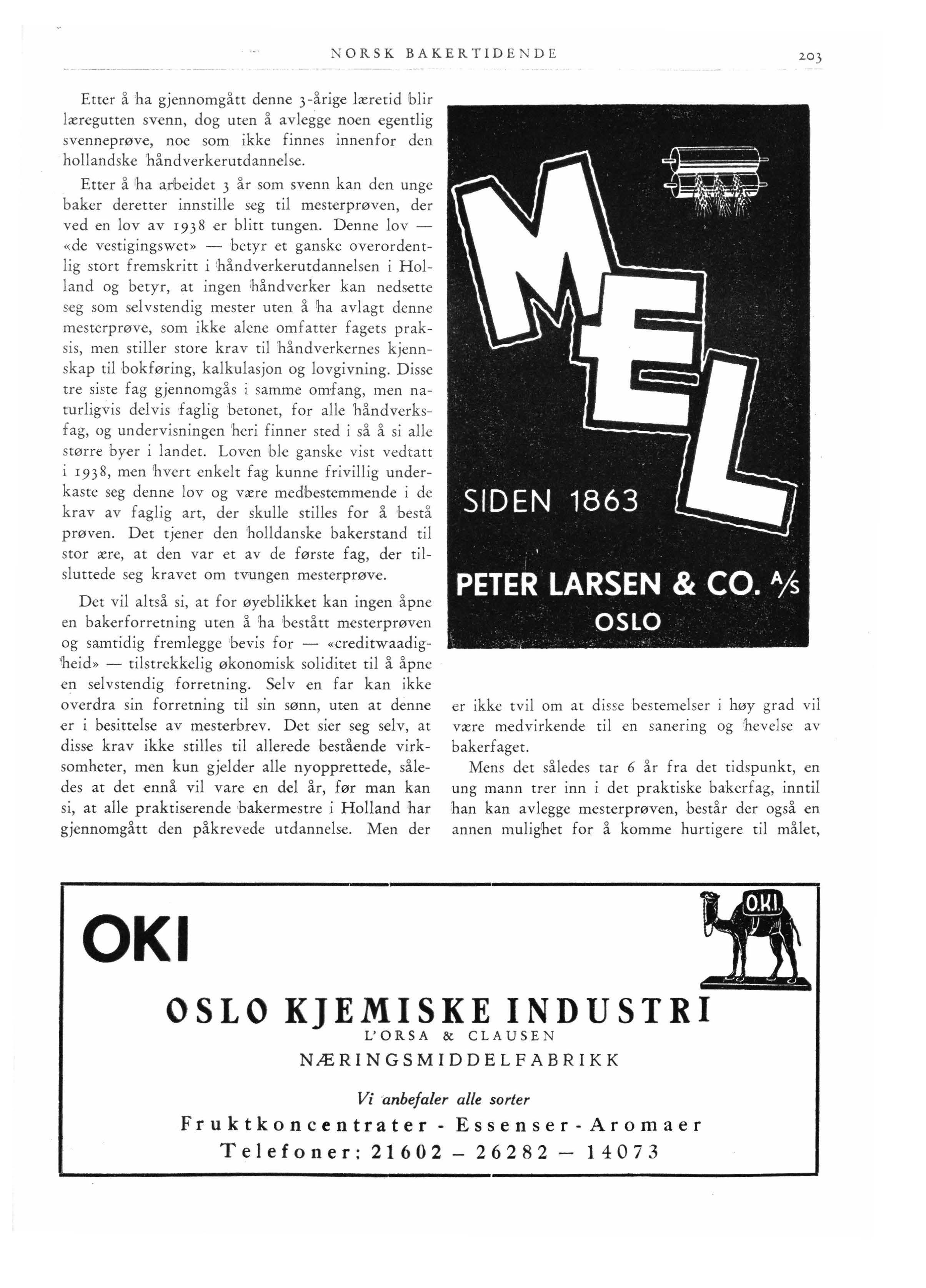 Etter å !ha arbeidet 3 år som svenn kan den unge baker deretter innstille seg til mesterprøven, der ved en lov av r 9 3 8 er blitt tungen. Denne lov« de vestigingswet» - betyr et ganske overordentlig stort fremskritt i :håndverkermdannelsen i Hollan d og betyr, at ingen håndverker kan nedsette se g som selvstendig mester uten å ha avlagt denne mesterprøve, som ikke alene omfatter fagets praksis, men stiller store krav til håndverkernes kjennska p til bokføring, kalkulasjon og lovgivning. Disse tre siste fag gjennomgås i samme omfang, men naturligvis delvis faglig betonet, for alle h åndverksfag, og undervi sn ingen heri fin ner sted i så å si alle s tørre byer i landet. Loven ble ganske vist vedtatt i 1938, men 'hvert enkelt fag kunne frivillig underkaste seg denne lov og være medbestemmende i de krav av faglig art, der skulle stilles for å hestå prøven. Det tjener den 'holldanske bakerstand til stor ære, at den var et av de første fag, der tilsl uttede seg kravet om tvungen mesterprøve.