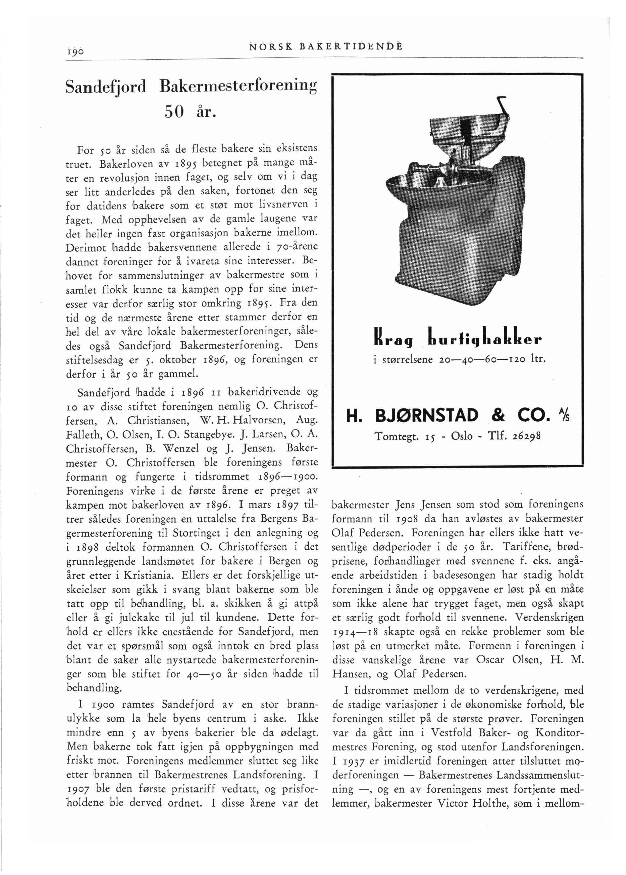For 50 år siden så de fleste bakere sin eksistens b O 0 truet. Bakerloven av 1895 etegnet pa mange mater en revolusjon innen faget, og selv om vi i dag ser litt anderledes på den saken, fortonet den seg for datidens bakere som et støt mot livsnerven i faget. Med opphevelsen av de gamle laugene var det heller ingen fast organisasjon bakerne imellom. Derimot hadde bakersvennene allerede i 70-årene dannet foreninger for å i vareta sine in ter esser. Behovet for sammenslutninger av bakermestre som i samlet flokk kunne ta kampen opp for sine interesser var derfor særlig stor omkring 189 5. Fra den tid og de nærmeste årene etter stammer derfor en hel del av våre lokale bakermesterforeninger, således også San def jord Bakermesterforening. Dens stiftelsesdag er 5. oktober 1896, og foreningen er derfor i år 50 år gammel.