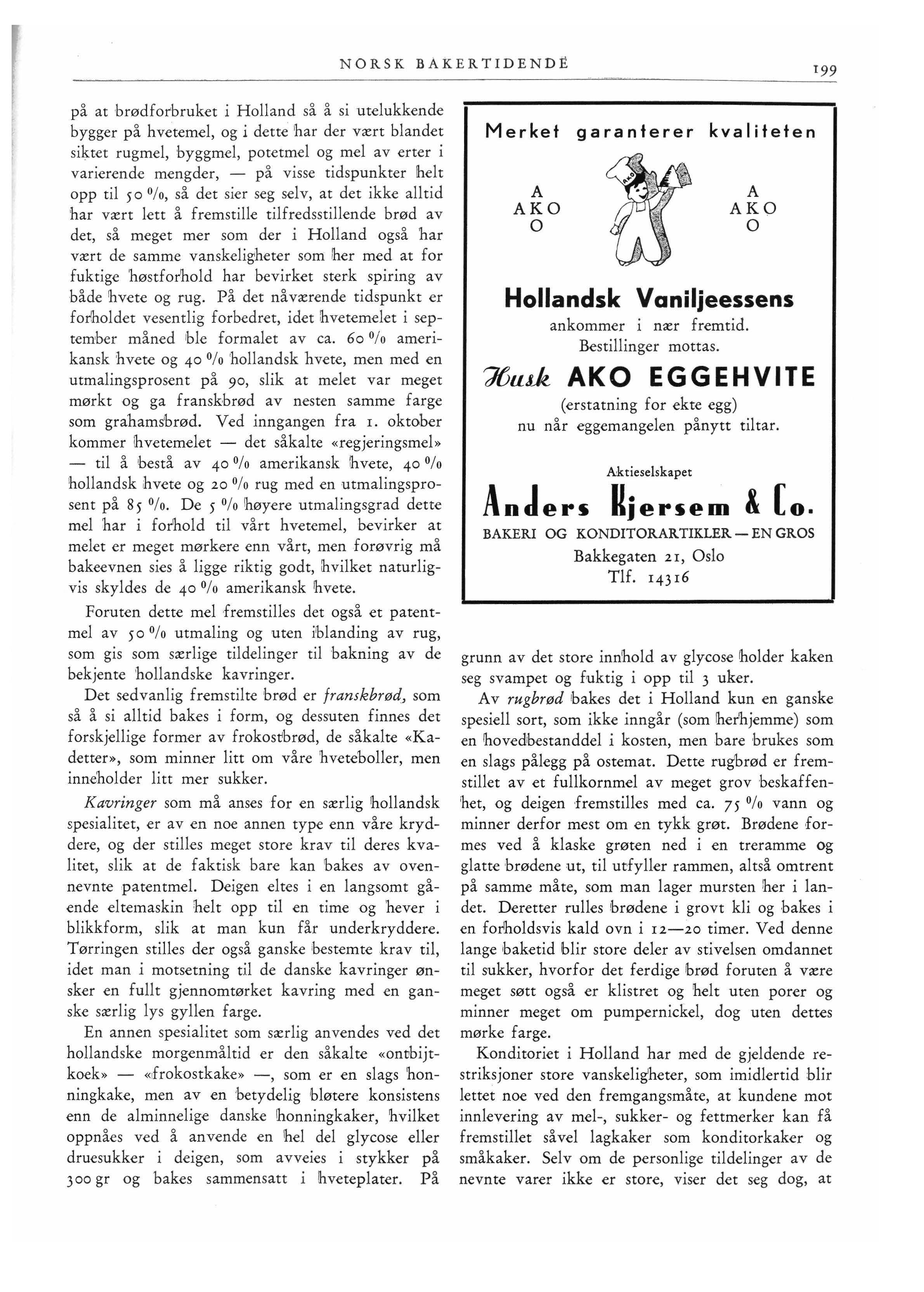 Før krigen stod det 'hollandske bakeri meget høyt og fremstilte en stor variasjon av fortreffelige brødsorter og forskjellige spesialiteter av !høy rang. Under krigen har det holldanske bakerierverv vært utsatt for vanskeligheter, som sammenlignet med egne hjemlige besværligheter ne sten blekner. Som i alle andre land har bakerne vært utsatt for å få deres tildelinger skåret betydelig ned, - nedskjæringer der for sukker og fettstoffs vedkommende ennå i dag 'beløper seg til ca 70 °/ o av før-krigsforbruket. Men utover dette !har det vært store vanskeligheter med melet, i hvilket der på visse tidspunkter har vært blandet forskjellige melsorter, som ellers ikke hører !hjemme i mel. Man må huske