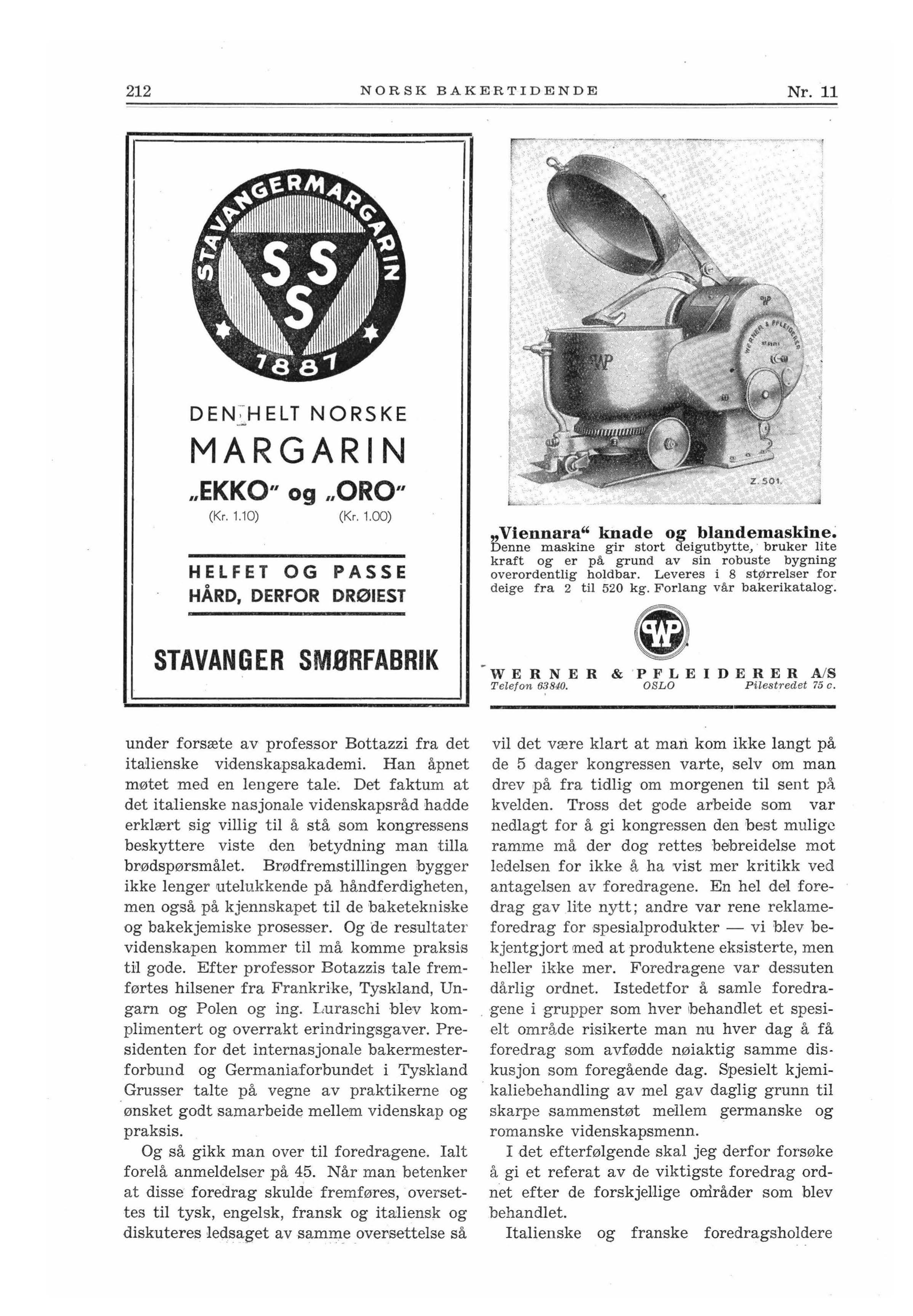 vil det være klart at mari kom ikke langt på de 5 dager kongressen varte, selv om man drev på fra tidlig om morgenen til sent på kvelden. Tross det gode arbeide som var nedlagt for å gi kongressen den best mulige ramme må der dog rettes bebreidelse mot ledelsen for ikke å ha vist mer kritikk ved antagelsen av foredragene En hel del foredrag gav lite nytt; andre var rene reklameforedrag for spesialprodukter - vi blev bekjentgjort med at produktene eksisterte, men heller ikke mer. Foredragene var dessuten dårlig ordnet. Istedetfor å samle foredra. gene i -grupper som hver 1behandlet et spesielt omr å de risikerte man nu hver dag å få foredrag som avfødde nøiaktig samme diskusjon som foregående dag. Spesielt kjemikaliebehandling av mel gav daglig grunn til skarpe sammenstøt mellem germanske og romanske videnskapsmenn.