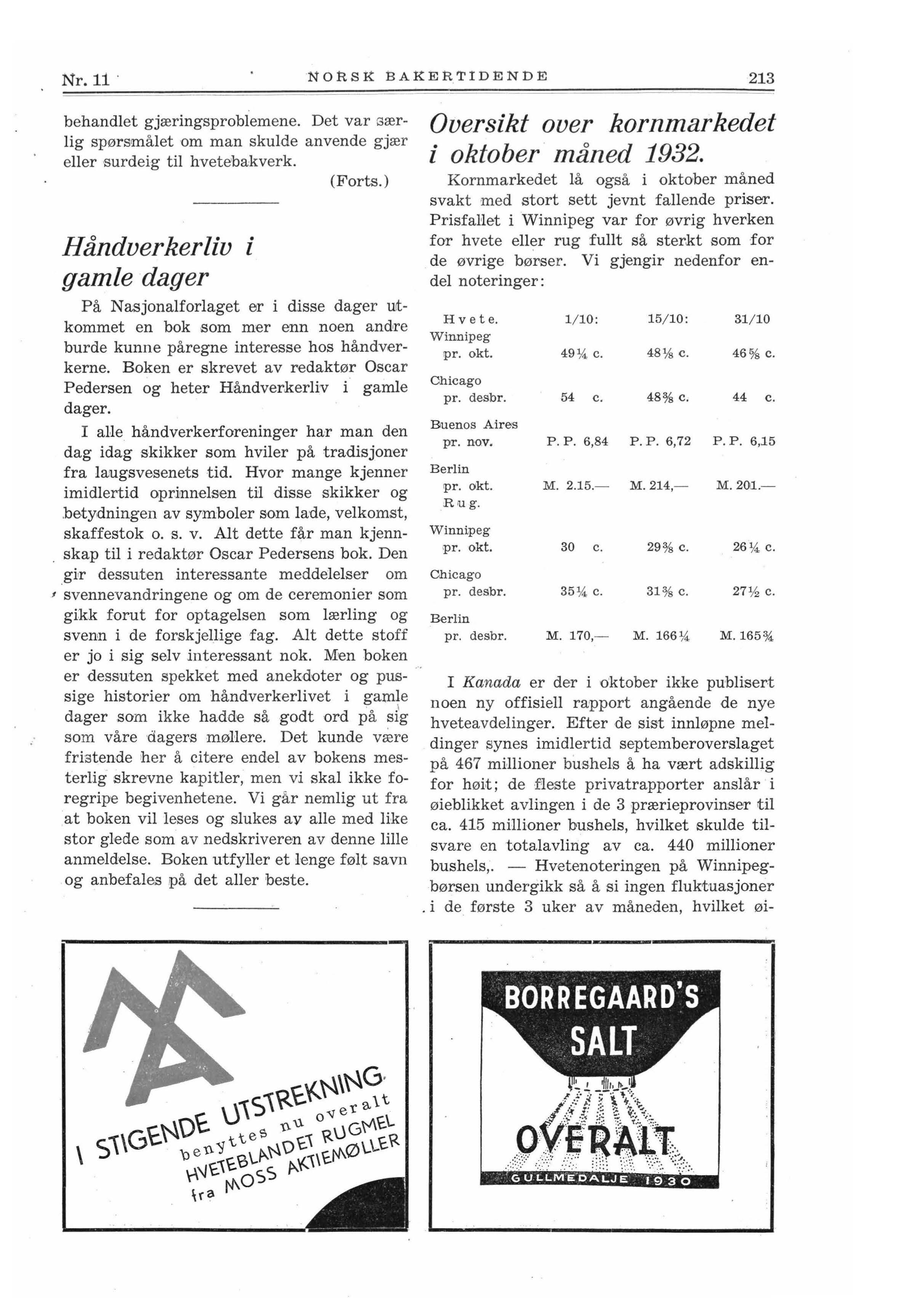 I n n h o l d : Melk i brØdet. - Kort oversikt over melk- og myseforsøkene ved Bakerlaboratoriet.På studiereise til den evige stad (forts.). - Håndverkerliv i gamle dager. - Oversikt over kornmarkedet i oktober 1932. - Fortegnelse over de firmaer som averterer i Norsk Bakertid ende.