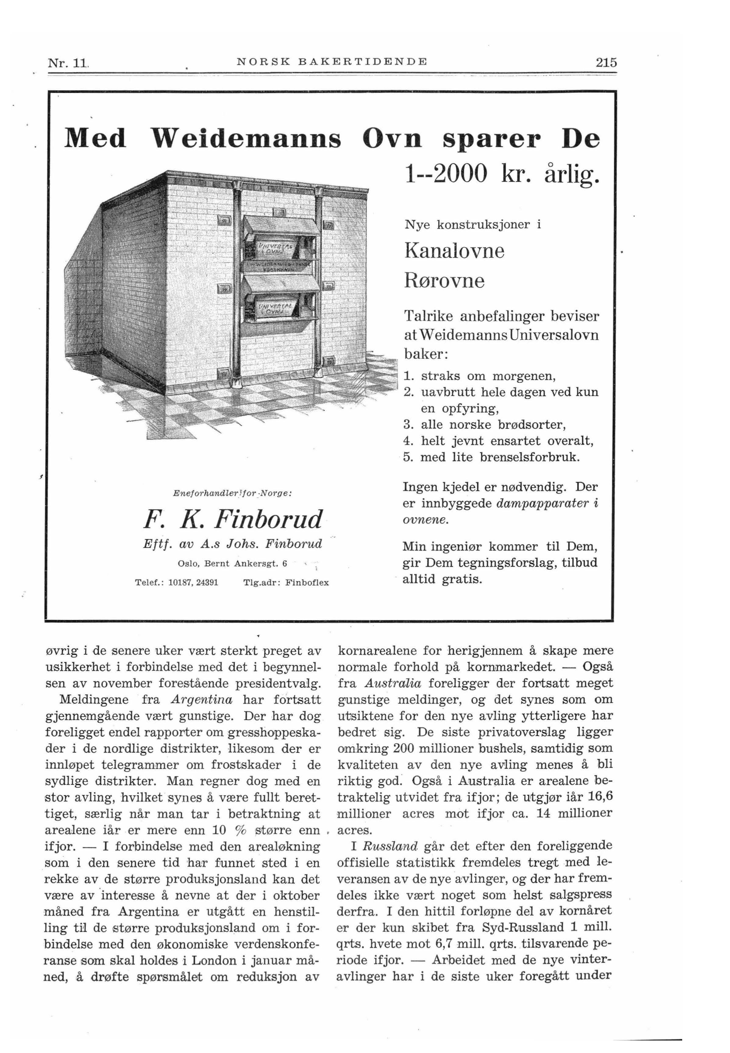 stort sett gode værforhold. - Der er fra Fortegnelse over firmaer som averterer i Norsk Bakertidende. offisielt hold meddelt at der ikke lenger vil bli a:rbeidet for noen fo r tsatt økning av arealene ; man vil fremtidig konsen t rere sig om bedre og mere effektiv e dyrkningsmetoder, anvendelse av bedre så k o rn, rikelige gj ød- _ ningsstoffe r o. s. v Der h a r for øvrig funn e t st ed en omorganisa,sjon innen ledelsen, hvorved man håper å få mere effektiv kontroll med den innenlandske kornproduksjon og korntransport. - Efter det som hittil foreligger synes de tidlig ~re formodninger om en minimal eksport fra Russland i dette kornår fullt ut å ville sl å til.