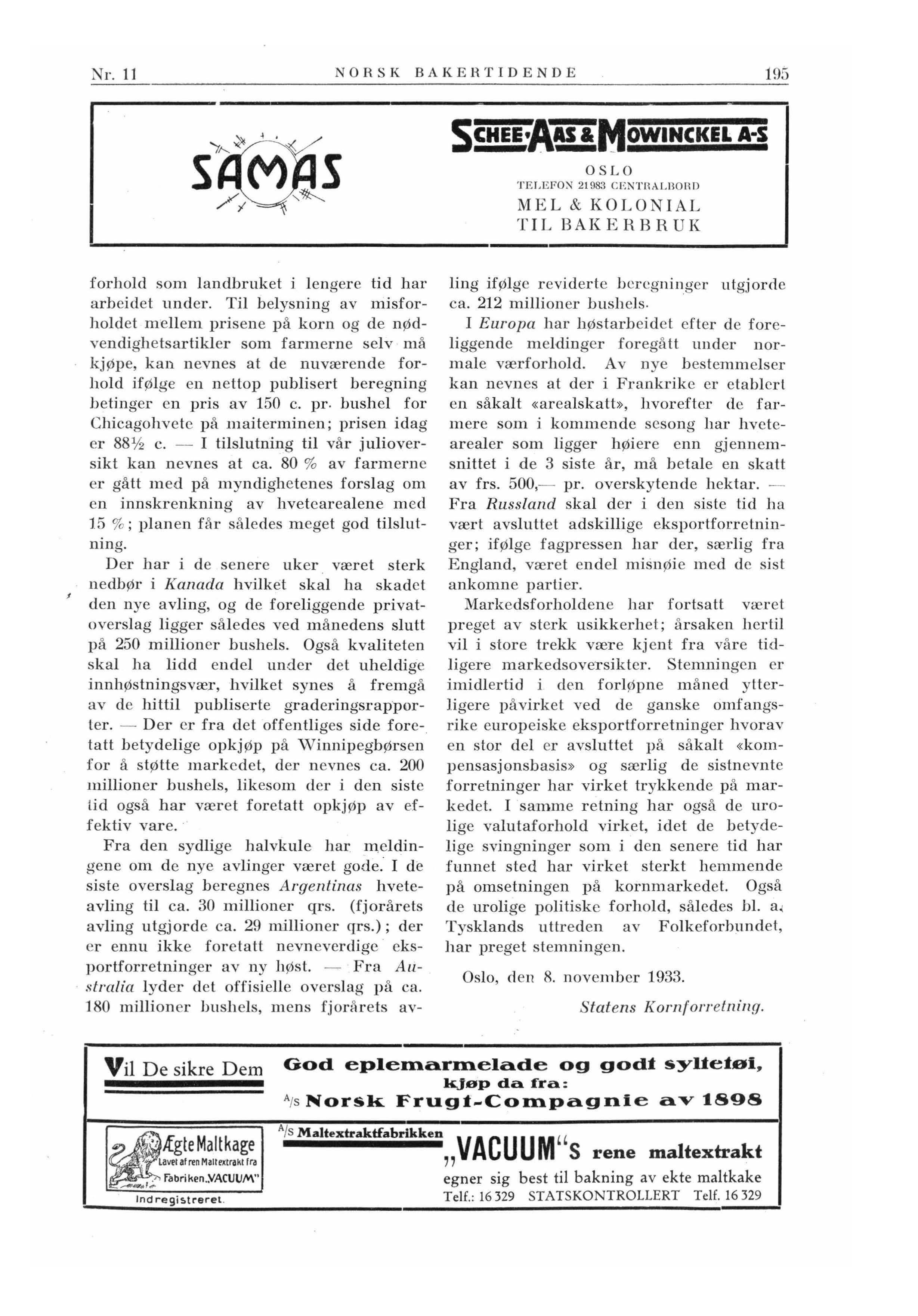 tidli gere normale forhold betraktedes som den l edende kornbørs i verden, efter hvert antatt s t erkere preg av de lokale forhold i Statern e og den spj]ler nu en l angt mindre rolle enn tidligere v e d bedømmelsen av el e internasjonale markedsforhold. Denne utvik lin g er ytterligere blitt forsterket ved siste års dårlige høstresultater, hvorv ed d e fra ele foregående år disponible beho ldninger på det nærmeste vil gå med til å dekke hjemmeforbruket. Notering e ne p å Chicagobørsen har således i l engere tid ligget høi e re enn prisene på de øvrige eksportmarkeder. I den forløpne måned har der imidlertid funnet sted ende l hvetesa l g fra Pasifickysten til Orienten, visstno k delvis også til Europa; disse salg er kom- , met istand ved tilskudd fra statens side i henhold til den ordning som b l ev omtalt i vår forrige mån e dsoversikt. - Der er i den siste tid foretatt betydelig e hveteopkjØp fra det offentl i ges side for fremstilling av mel til fordeling i de distrikter som er sterkest rammet av arbeidsløshet og nød. - D e r er e nnvidere truffet forholdsregler for å hindre skade li ge inngrep på kornmarkedet fra spe kulant enes side. - Som omtalt i dagspressen har der i d e . siste uk e r pågått en «farmerstreik » over store distrikter, efter hvad der medde l es med til slutning av et par millioner farmere, i den hensikt å skaffe nogen bedring i de ytterst vanske lig e Øko nomisk e