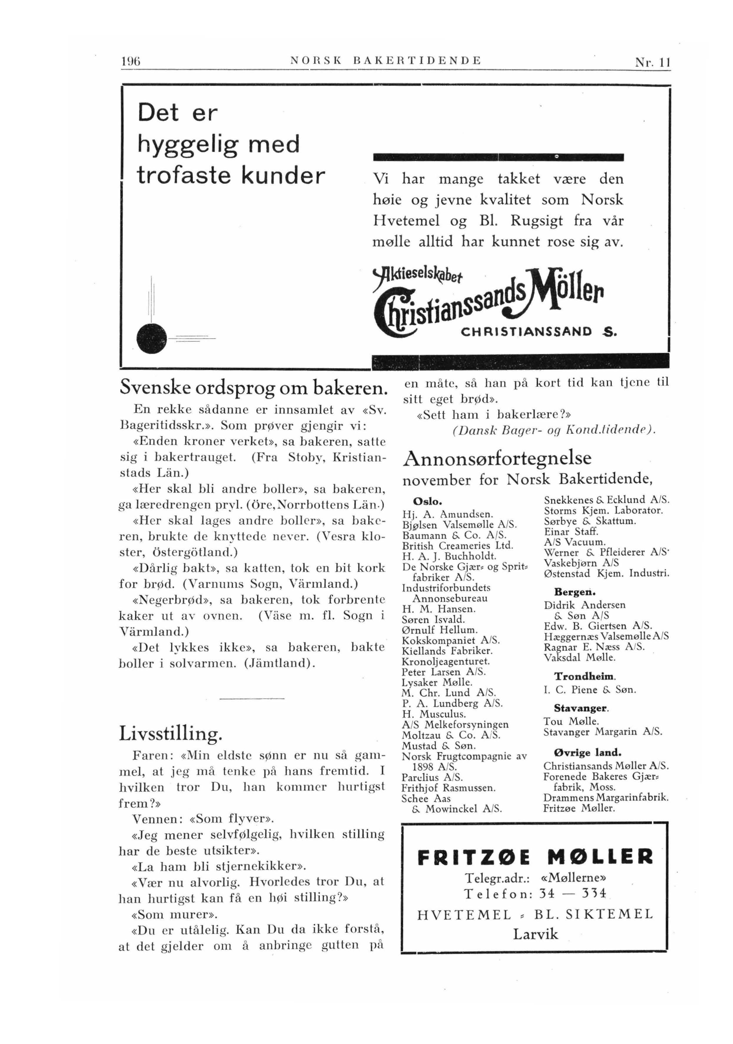 Slik som forholdene er nu innen bak'erstanden, må alt dette propaganda- og reldamearbeid e motarbeide bakernes interesser i høi grad. Sist under melkem e ssens å pning, blev det fremholdt at kosthold et l.mrde omlegges fra unasjonalt brødspise, til nasjonal potetspisning og melkedrikkin g. Men d e tt e motsetningsforhold behøver ikk e å være tilsted e Istedenfor sin Lilsyn ela tend e konservativ e holdning mot a lt nytt, enten det er på e rnæringsm ess ig ell er nasjonal basis, må bakerstand e n nu