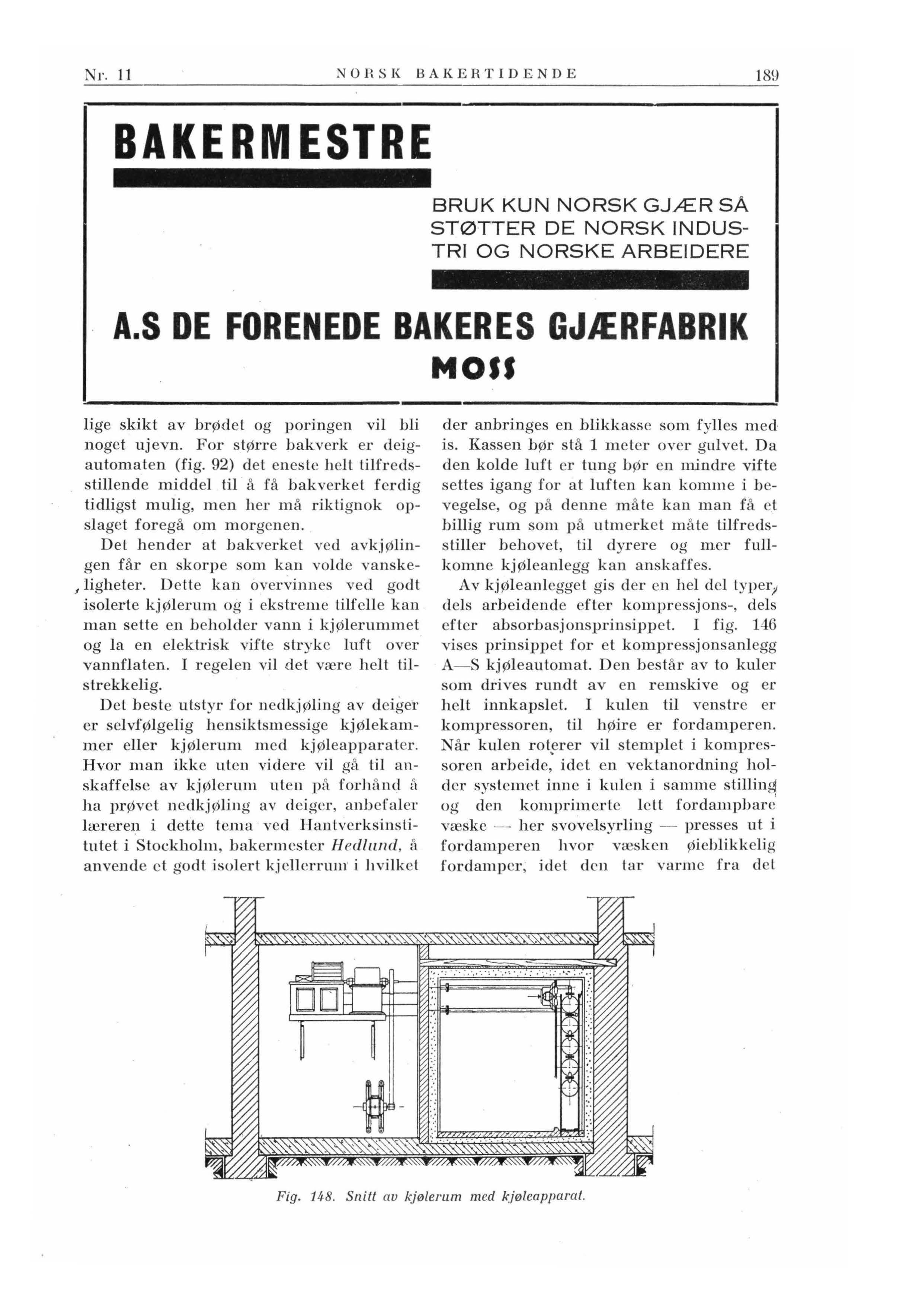 Spørsm.å l et om anvendelse av kjøleanlegg i bakeriene er ikke nytt. Bakeriene arbeider ofte med råstoffer hvis tilfredsstillende lagring er avhengig av at t~mperaturen ikke blir for hØi, det kan være mel og fløte, egg, gjær, i det hele stoffer som ve d bakterie- eller gjæringsvirksomhet har lett for å bederves. Enkelte steder kunde man kanskje også trenge avkjøling av mellagrene, men det vilde nepp e svare regning, og her må man ordne sig p å annen måte.