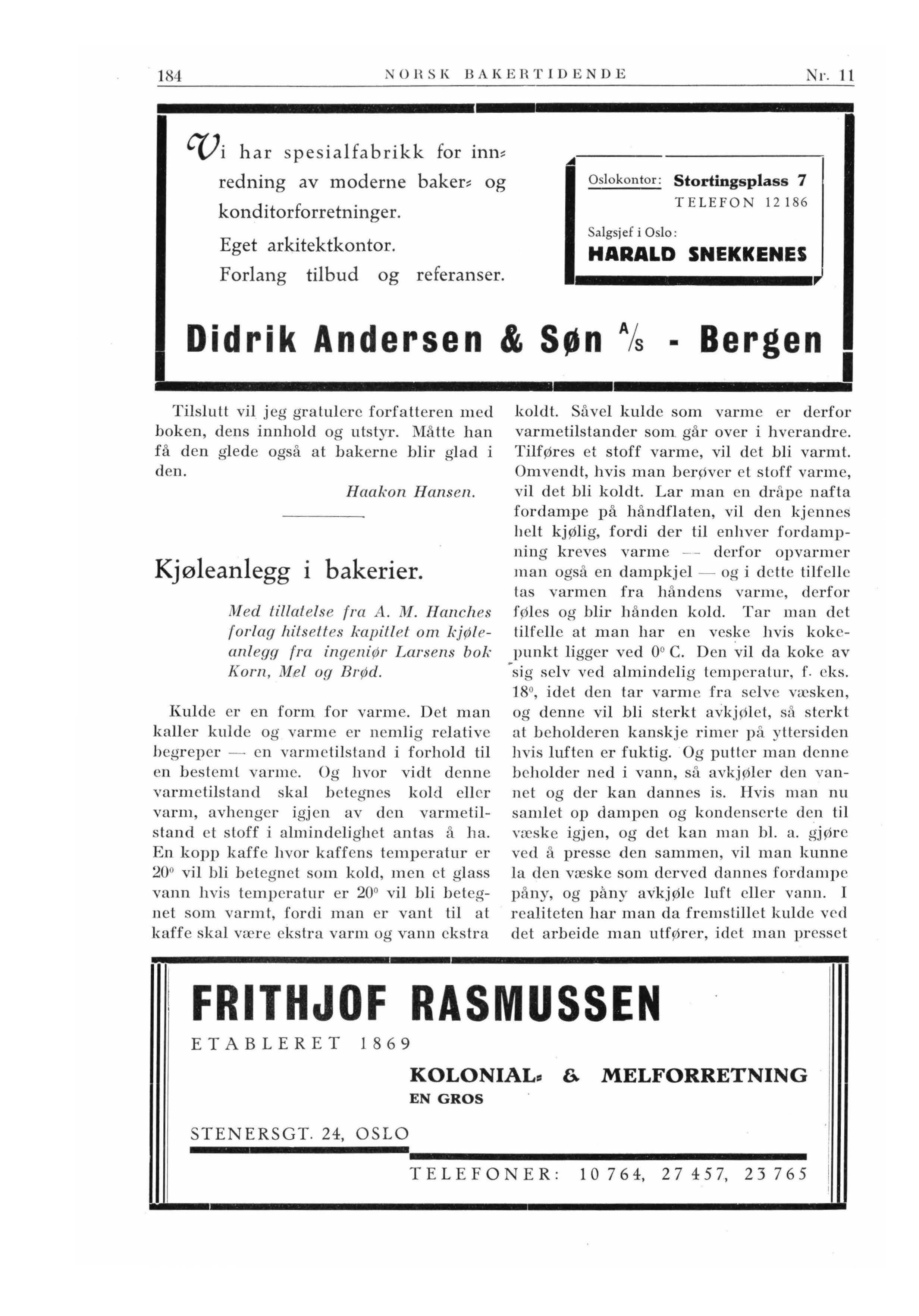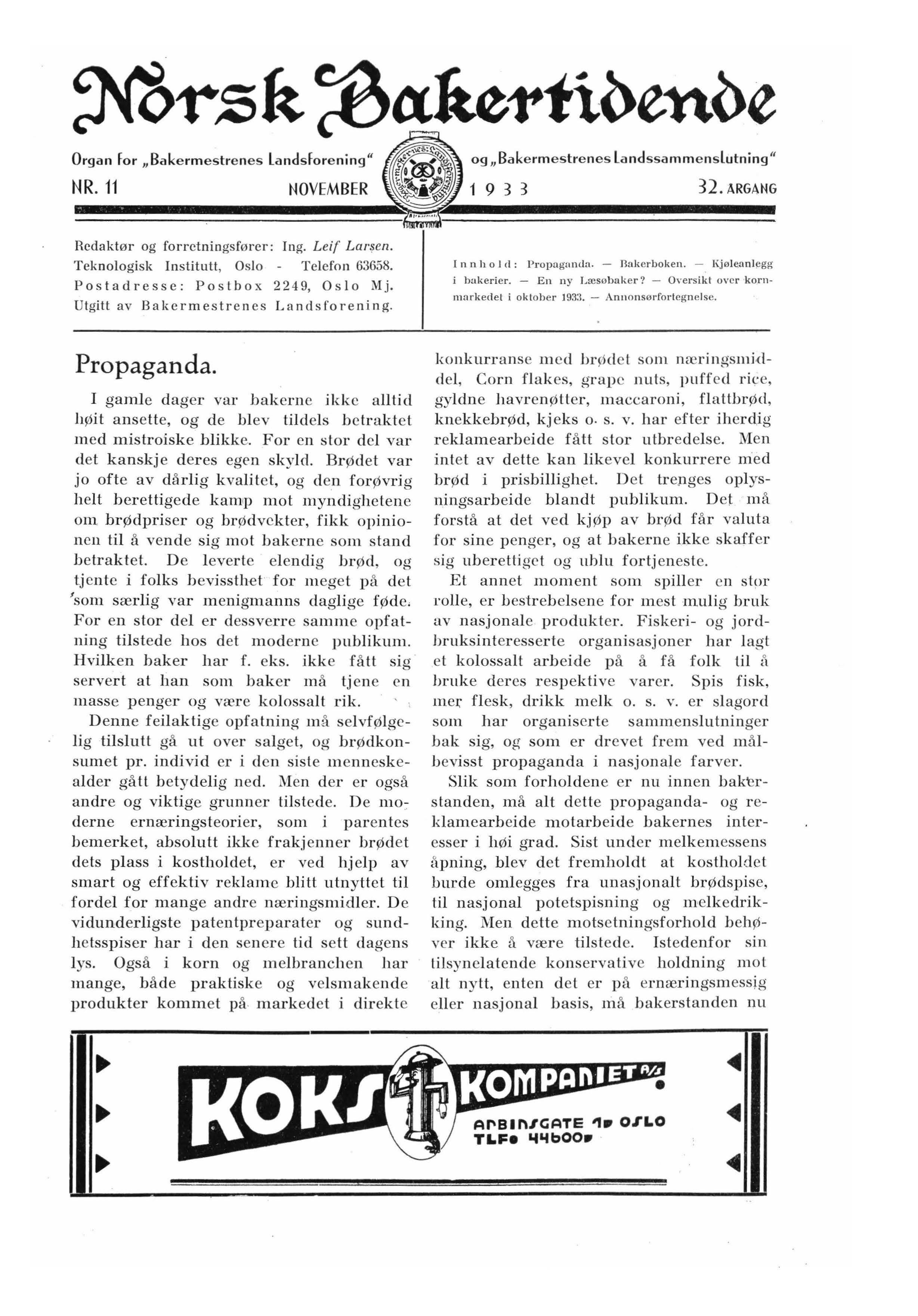 Innhol <1 : Propaganda. - flakerboken -. Kj ø l ~nn l egg i bakerier - En ny Læsobak e r ? - Oversikt over kornmarke<let i oktober 193:l. - Annonsørfortegnels e.