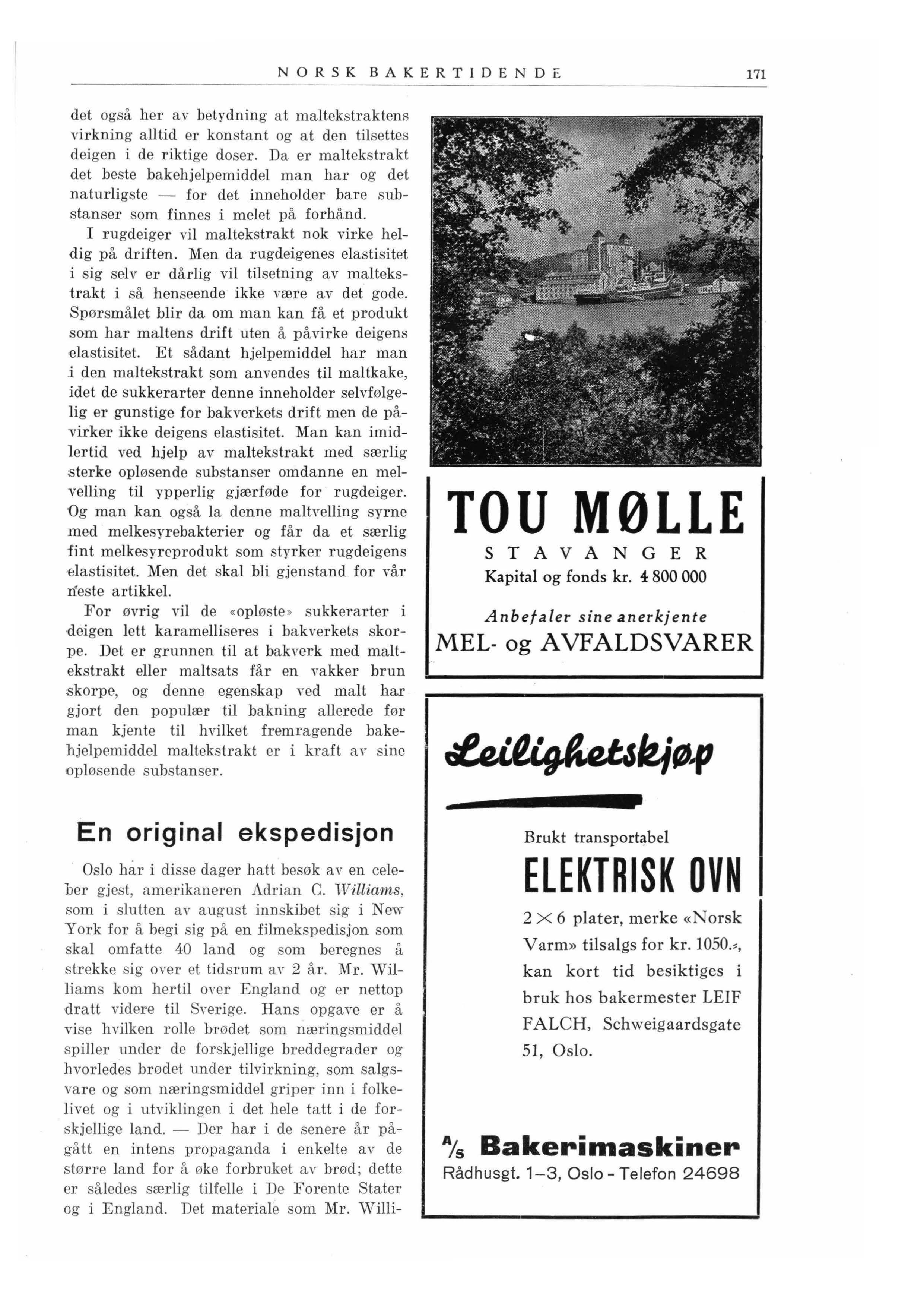 Oslo hår i disse dager hatt besøk av en cel eber gjest , amerikaneren Adrian C. Williams, som i slutten av august innskibet sig i New York for å begi sig på en filmekspedisjon som skal omfatte 40 land og som beregnes å strekke sig OYer et tidsrum av 2 år Mr. Williams kom hertil over England og er nettop dratt videre til SYerige. Hans opgave er å vise hvilken rolle brødet som næringsmiddel spiller under de forskjellige breddegrader og hvorledes brødet under tilvirkning, som salgsvare og som næringsmiddel griper inn i folkeli vet og i utviklingen i det hele tatt i de forskjellige land. - Der har i de senere år pågått en intens propaganda i enkelte av de større l and for å øk e forbruket av brød; dette er således særlig tilfelle i De Forente Stater og i England. Det materiale som Mr. Willi-