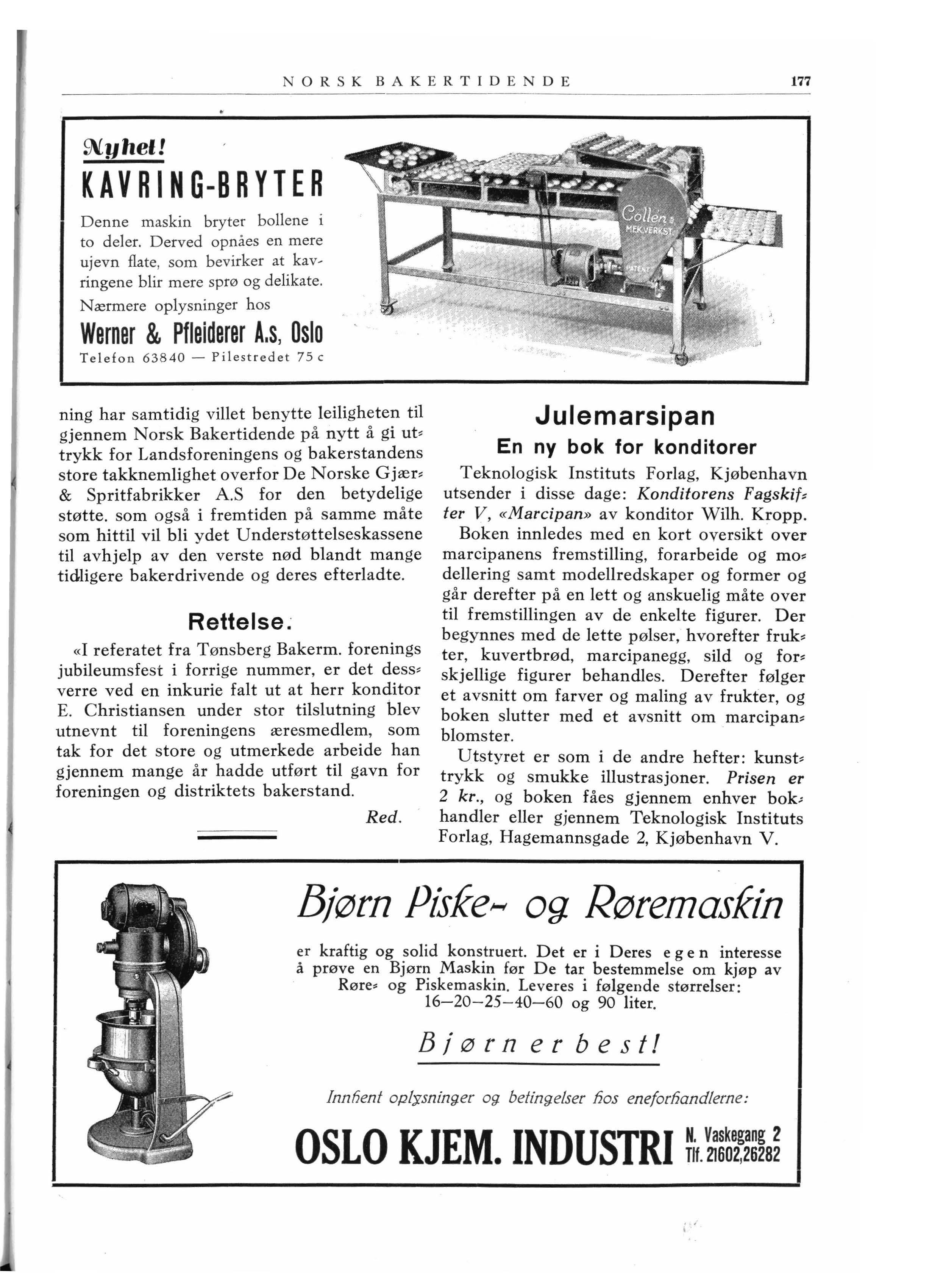 Teknologisk Instituts Forlag, Kjøbenhavn utsender i disse dage: Konditorens Fagskif:: ter V, «Marcipan» av konditor Wilh. Kropp. Boken innledes med en kort oversikt over marcipanens fremstilling, forarbeide og mo:: dellering samt modellredskaper og former og går derefter på en lett og anskuelig måte over til fremstillingen av de enkelte figurer. Der begynnes med de lette pølser, hvorefter fruk :: ter, kuvertbrød, marcipanegg, sild og for:: skjellige figurer behandles. Derefter følger et avsnitt om farver og maling av frukter, og boken slutter med et avsnitt om marcipan:: blomster.