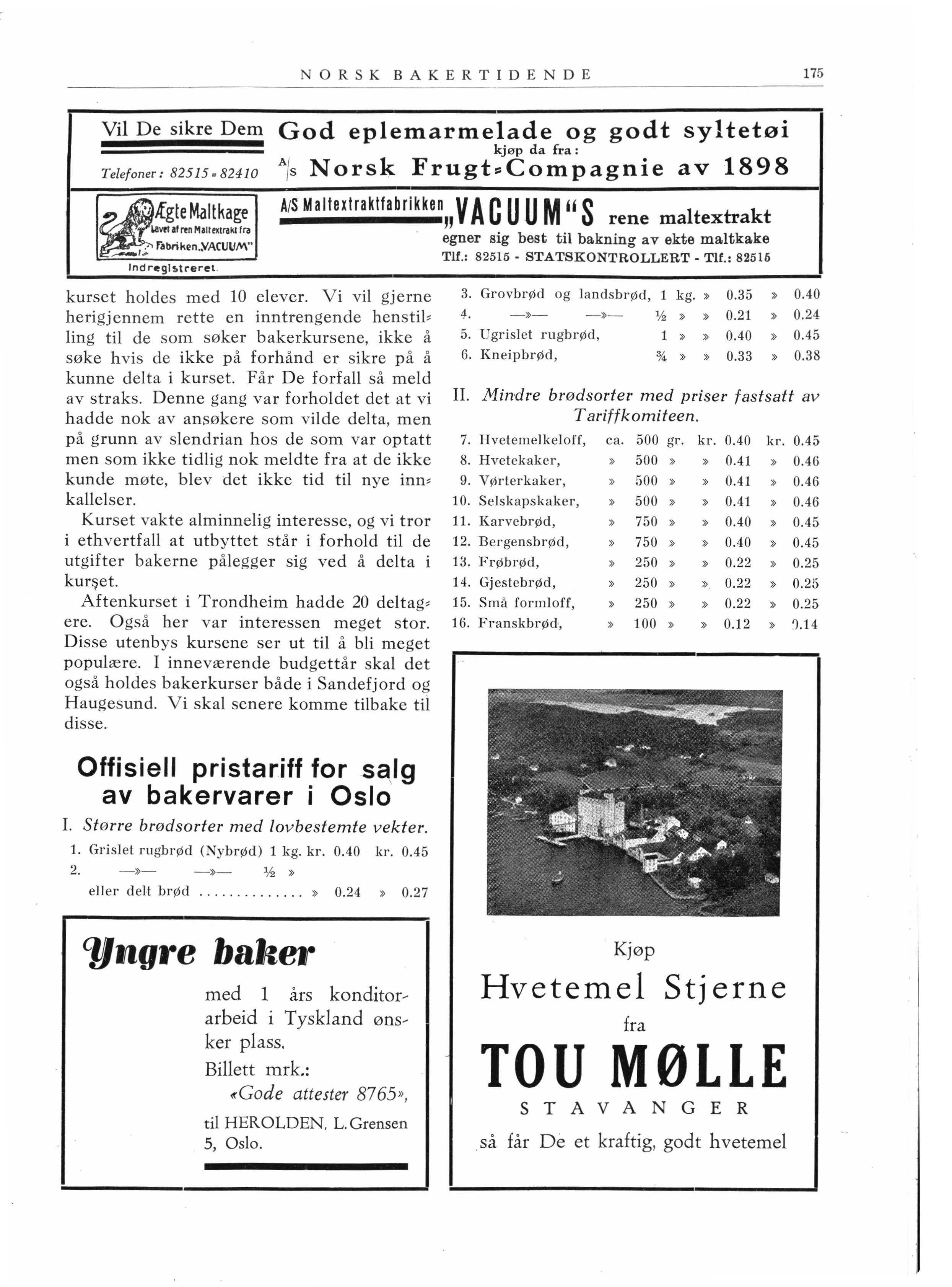 Trustkontrollen godkjente de fastsatte pri• ser, men nektet å godkjenne forhøielsen av forhandleravansen således at prisene på gris• let og ugrislet husholdningsbrød samt grov• brød kun blev tillatt forhøiet med 3 øre. I henhold til disse bestemmelser - som gjelder for hele landet - er brødprisene satt op. Pristariffen for Oslo i henhold til de nye be• stemmeiser er inntatt annetsteds i vårt blad . På området om fastsettelse av priser for bakervarer har det vist sig at der på mange steder, tross Landssammenslutningens uttryk• kelige oplysningsarbeide, råder adskillig uklar• het for ikke å si forvirring om forståelsen eller praksis av trustkontrollkontorets forskrifter. På flere steder har således de lokale kommu• nale kontrollnevnder tatt sig myndighet til å fastsette priser. Dette er helt i strid med pris, forskriftene. Kontrollnevndene skal bare kon• kontrollere, men de kan ikke fastsette priser.