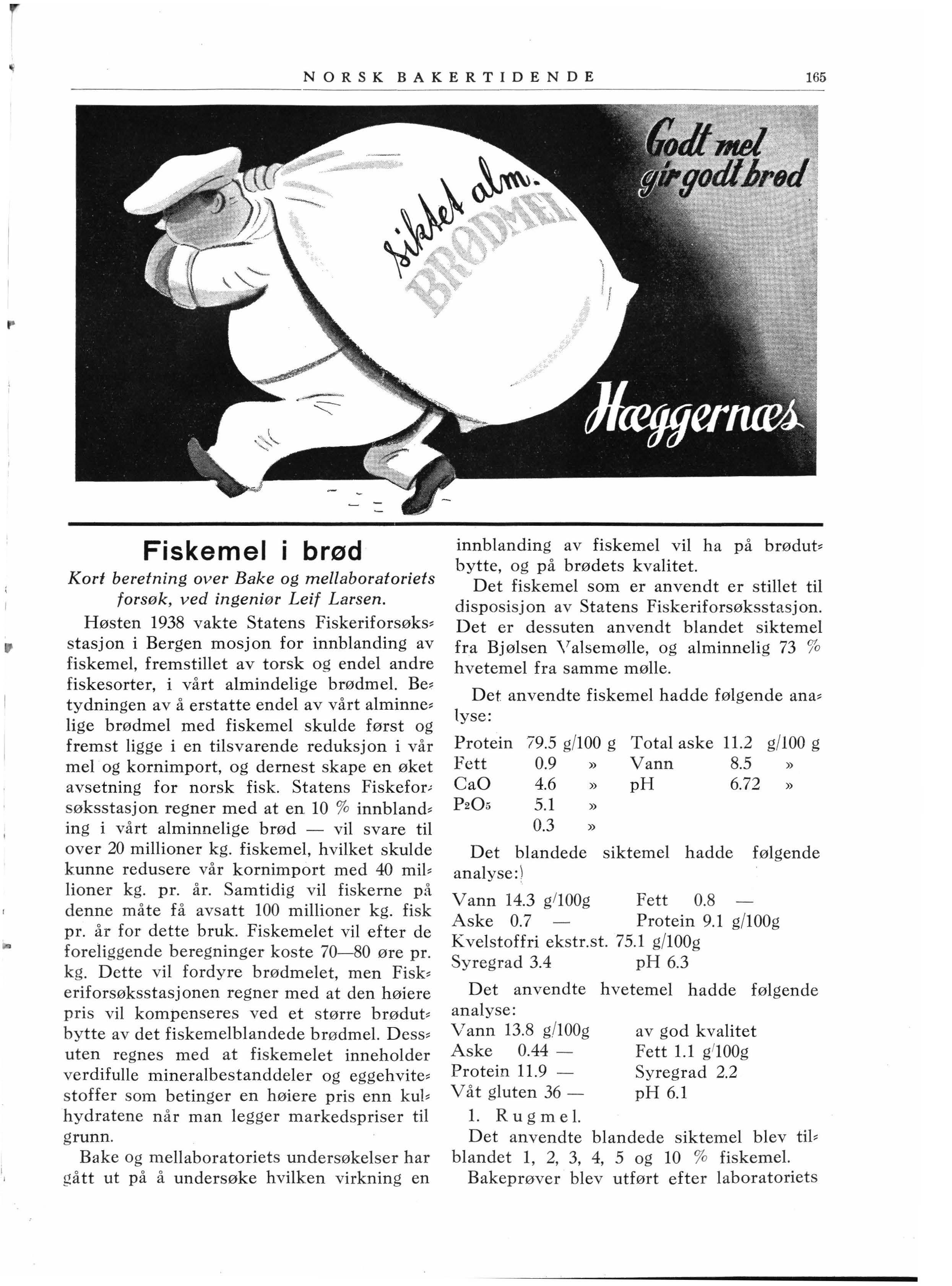 Høsten 1938 vakte Statens Fiskeriforsøks• stasjon i Bergen mosjon for innblanding av fiskemel, fremstillet av torsk og endel andre fiskesorter, i vårt almindelige brødmel. Be" tydningen av å erstatte endel av vårtalminne• lige brødmel med fiskemel skulde først og fremst ligge i en tilsvarende reduksjon i vår mel og kornimport, og dernest skape en øket avse tnin g for norsk fisk. Statens Fiskefor: søksstasjon regner med at en 10 % innbland• ing i vårt alminnelige brød - vil svare til over 20 millioner kg. fiskemel, hvilket skulde kunne redusere vår kornimport med 40 mil• lianer kg. pr. år. Samtidig vil fiskerne på denne måte få avsatt 100 millioner kg. fisk pr. år for dette bruk. Fiskemelet vil efter de foreliggende beregninger koste 70-80 øre pr. k g . Dette vil fordyre brødmelet, men Fisk< eriforsøksstasjonen regner med at den høiere pris vil kompenseres ved et større brødut • bytte av det fiskemelblandede br ø dmel. Dess• uten regnes med at fiskemelet inneholder verdifulle mineralbestanddeler og eggehvite• stoffer som betinger en høiere pris enn kul • hydratene n å r man legger markedspriser til g runn.