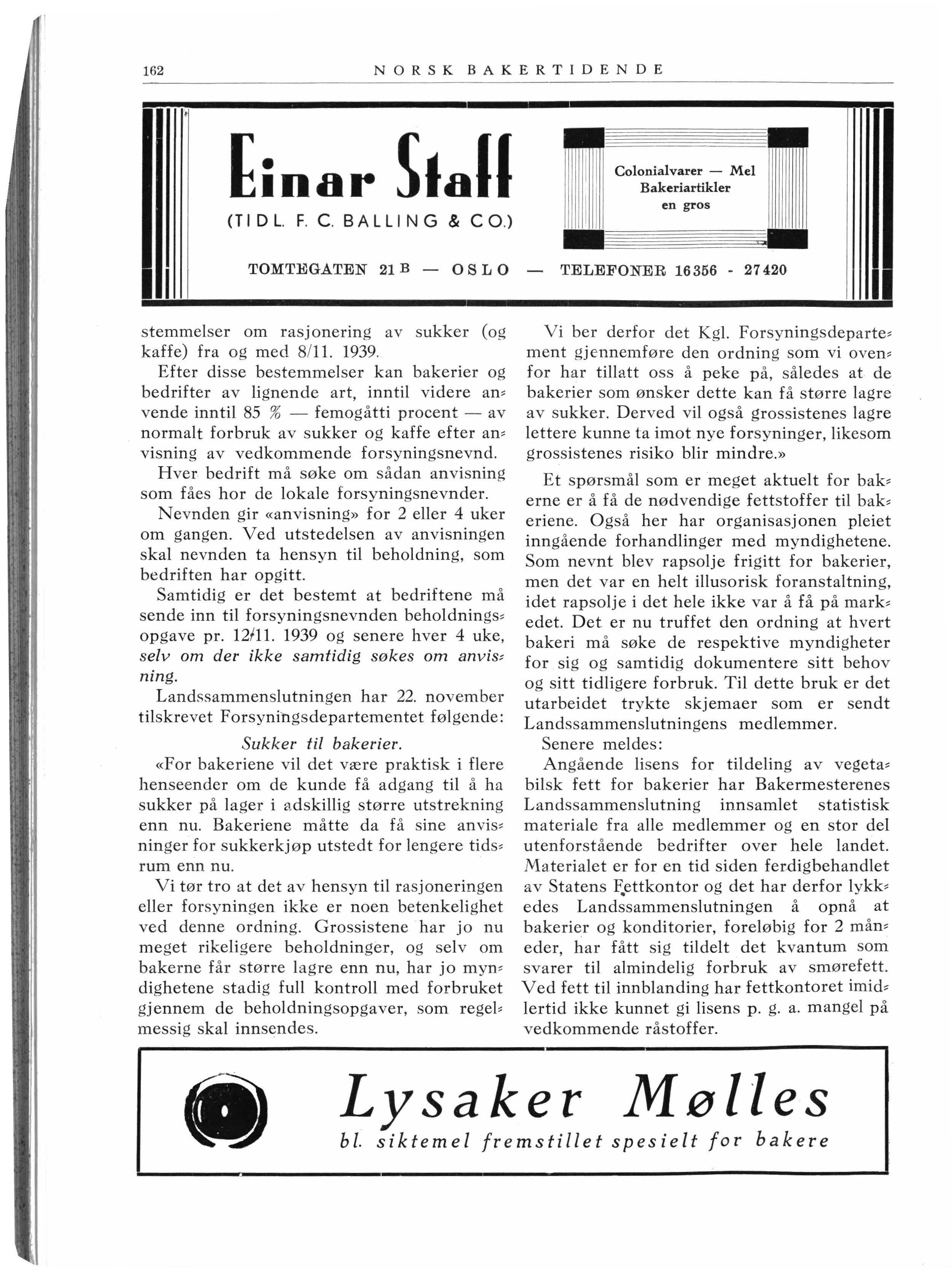 Vi tør tro at det av hensyn til rasjoneringen eller forsyningen ikke er noen betenkelighet ved denne ordning. Grossistene har jo nu meget rikeligere beholdninger, og selv om bakerne får større lagre enn nu, har jo myn • dighetene stadig full kontroll med forbruket gjennem de beholdningsopgaver, som regel• messig skal innsendes.
