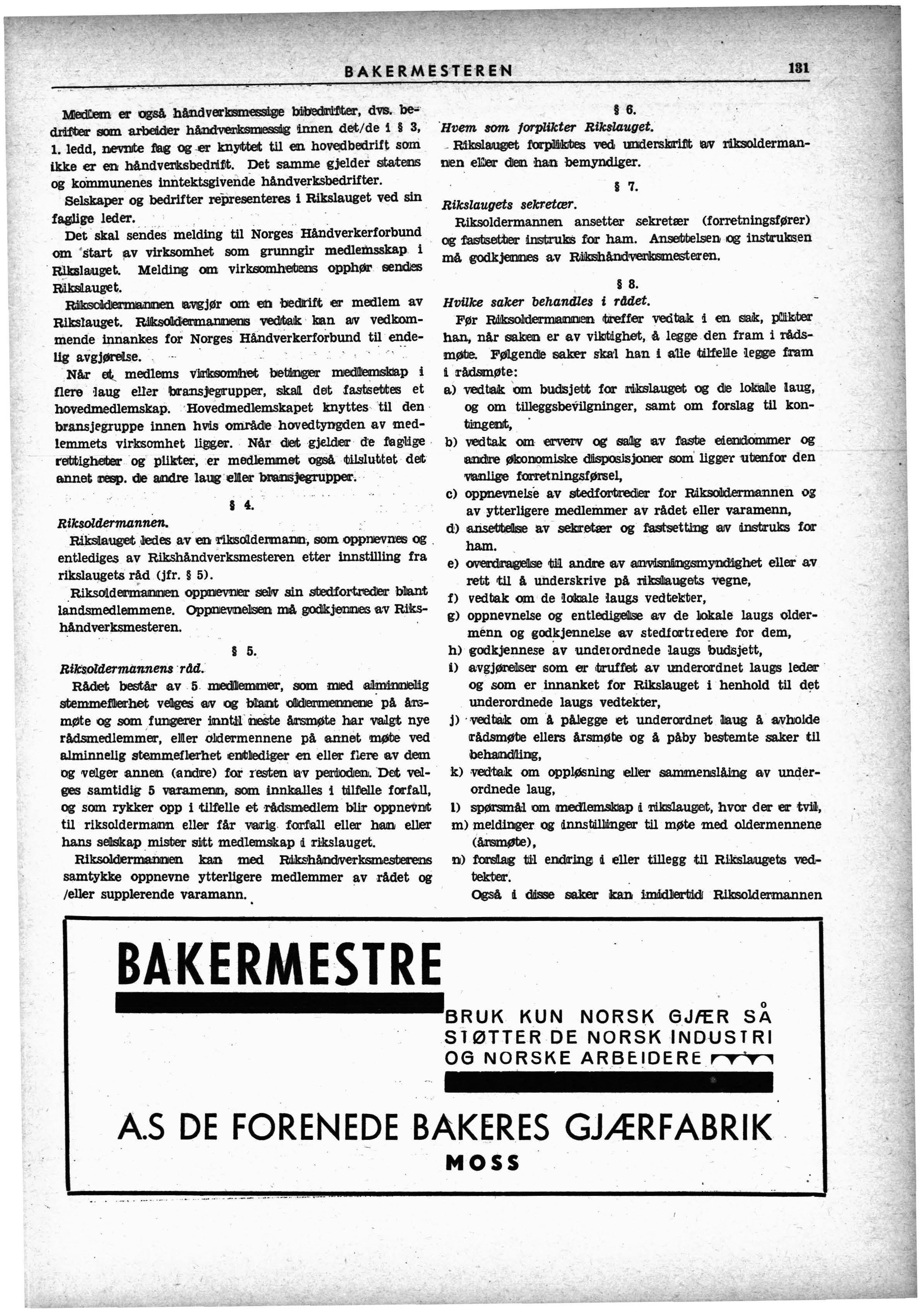 · Riksl.augets oppgave er 4 hfelpe og rdde bakermertrene, ikke minrt n4r det gjelder vanskel.igheter i denne tiden. Det er derfor ogsd av meget stor betydning for oss ug v4rt arbeid at bakerne ikke lar seg diktere av nemnder og anlt'e myndigheter tør saken er forelagt riksl.auget. Vi vil da ta oss av saken for bakermesteren og med den erfaring og innsikt vi sitter inne med sørge for den for bakermesteren best mulige løsning. Vær ikke redd for d skaffe oss bry - vi er til for 4 hjel.pe.