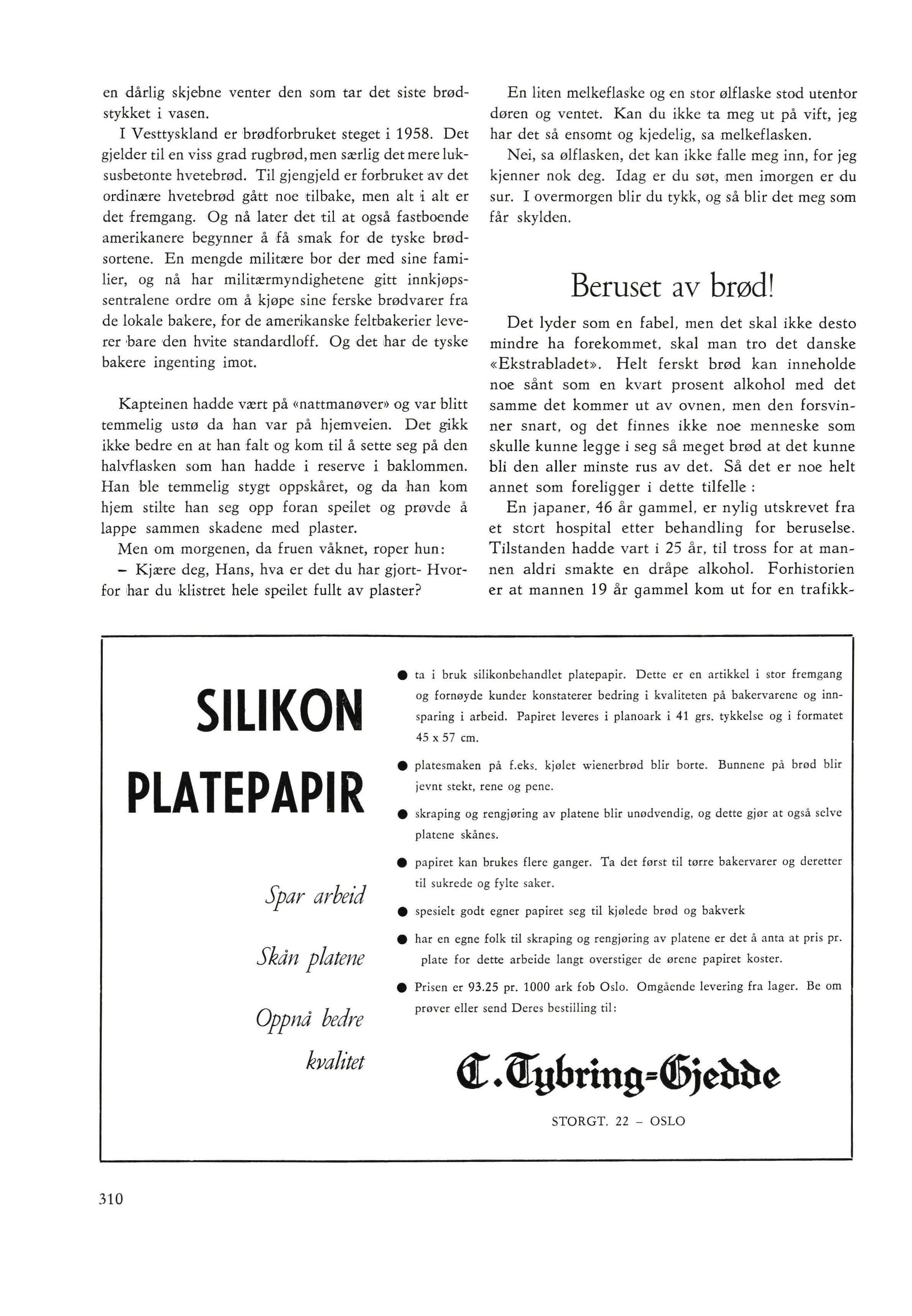 I Vesttyskland er brødforbruket steget i 1958. Det gjelder til en viss grad rugbrød, men særlig det mere luksusbetonte hvetebrød. Til gjengjeld er forbruket av det ordinære hvetebrød gått noe tilbake, men alt ,j ah er det fremgang. Og nå later det til at også fastboende amerikanere begynner å ifå smak for de tyske brødsortene. En mengde militære bor der med sine familier, og nå har militærmyndighetene gitt innkjøpssentralene ordre om å kjøpe sine ferske brødvarer fra de lokale bakere, for de amerikanske fekbakerier leverer ,bare den hvite standa!!dloff. Og det ihar de tyske bakere ingenting imot.