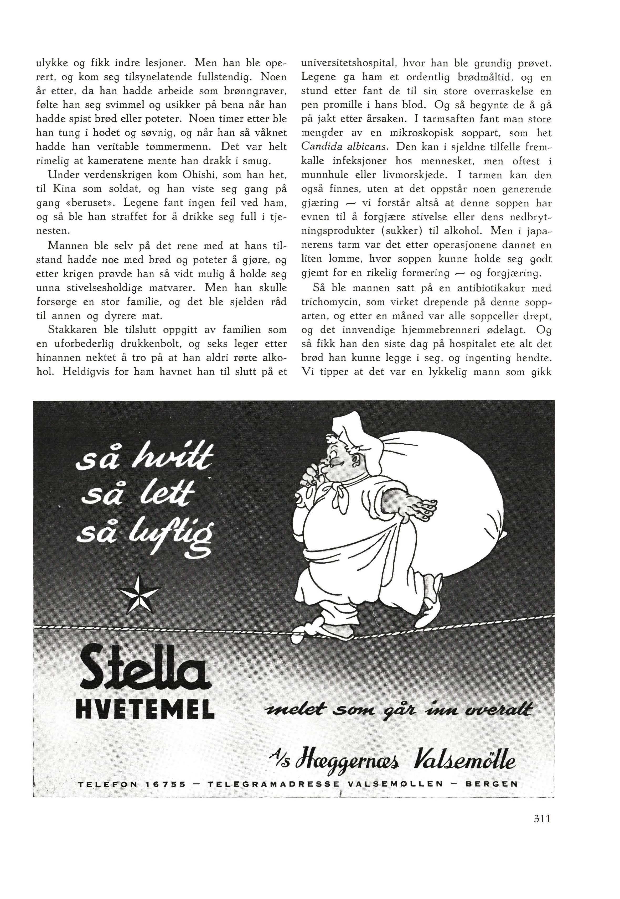 universitetshospital , hvor han ble grundig prøvet. Legene ga ham et ordentlig brødmåltid, og en stund etter fant de til sin store overraskelse en pen promille i hans blod. Og så begynte de å gå på jakt etter årsaken. I tarmsaften fant man store mengder av en mikroskopisk soppart, som het Candida albicans. Den kan i sjeldne tilfelle fremkalle infeksjoner hos mennesket , men oftest i munnhule eller livmorskjede. I tarmen kan den også finnes, uten at det oppstår noen generende gjæring - vi forstår altså at denne soppen har evnen til å forgjære stivelse eller dens nedbrytningsprodukter (sukker) til alkohol. Men i japanerens tarm var det etter operasjonene dannet en liten lomme, hvor soppen kunne holde seg godt gjemt for en rikelig formering - og forgjæring.